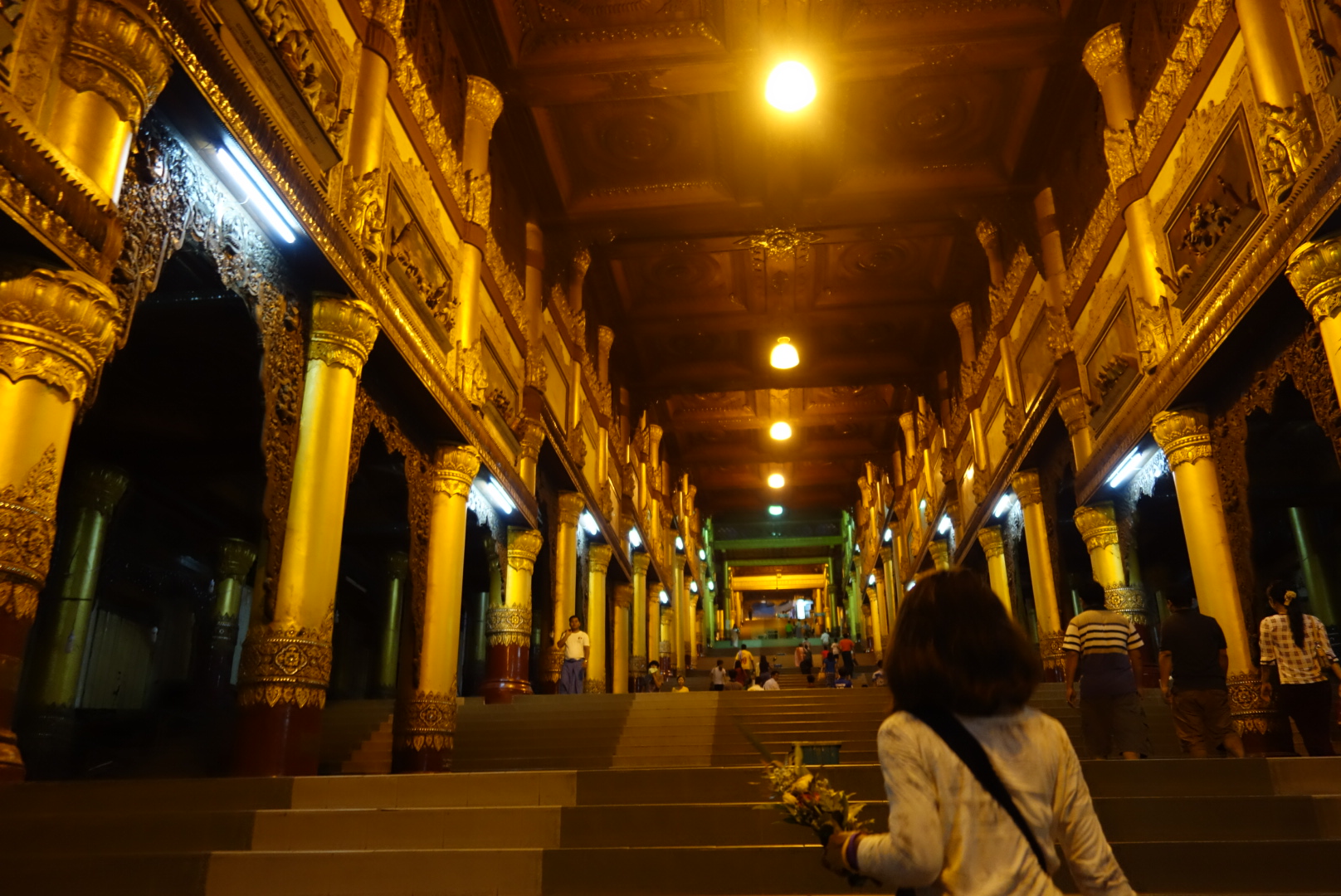 Um zur Shwedagon Pagoda zu gelangen muss man erst einmal ewig lange Treppen rauf steigen.