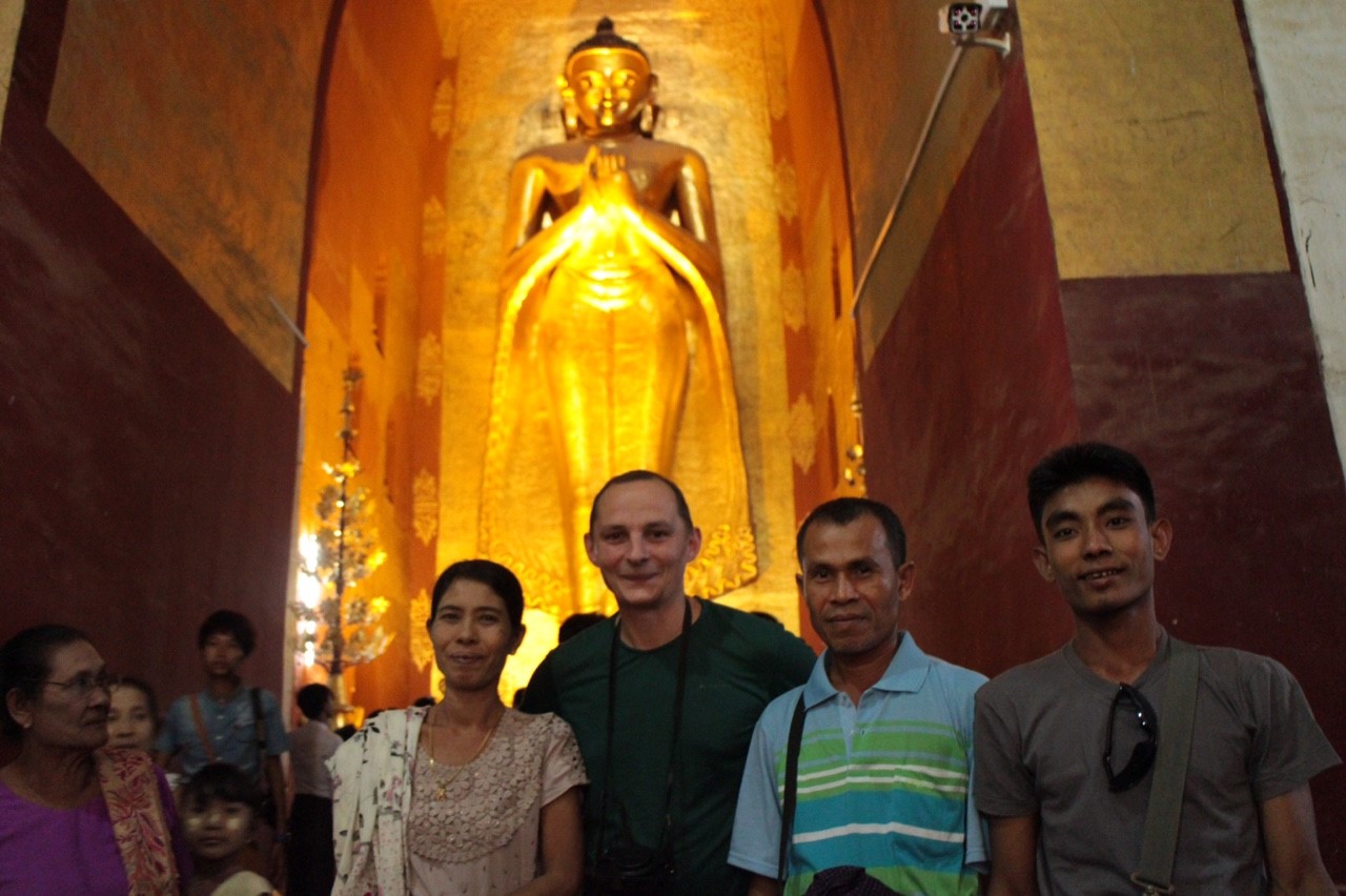 >>>>>บ่ายโมงบลก็ตื่น สองโมงเราก็พากันออกมาหาอะไรทาน แล้วก็ขับรถไปเรื่อยๆ เห็นเจดีย์ตรงไหนน่าแวะเราก็จอดพักเยี่ยมเยียน เจดีย์ที่นี่ส่วนใหญ่แล้วจะคล้ายกันหมด คือมีพระพุทธรูปด้านใน แต่พระพุทธรูปจะไม่เหมือนกันซะทีเดียว บ้างก็ห่มผ้าเหลือง ผ้าขาว ผ้าแดง หรือไม่ก็ผ้าดำ หัวพระพุทธรูปบางที่ก็คนละสีกับลำตัว ทำให้เวลาเราเข้าไปเยี่ยมชมบางที่ก็รู้สึกสงบ รู้สึกดี แต่บางที่ก็รู้สึกเฉยๆถึงขั้นไม่เข้าใจสงสัย แล้วเราก็ขับรถไปยังแม่น้ำฝั่งพุกามเก่า ผ่านประตูกำแพงเมืองเก่าแก่ ผ่านที่พักม้า ผ่านพระราชวังแต่ไม่เข้า เราขับไปเรื่อยเห็นปราสาทใหญ่สวยงาม นักท่องเที่ยวชาวพม่าค่อนข้างเยอะเลยขอแวะสักหน่อย คือเจดีย์วิหารอนันดา ที่นี่มีพระพุทธรูปทองยืนสง่าอยู่ทั้งสี่ทิศ โดยพระพุทธรูปทั้งสี่ทิศนั้นจะมีรูปร่าง หน้าตา และลักษณะที่แตกต่างกันออกไป ความรู้นิดนึง ที่นี่เป็นวิหารที่ได้รับการยกย่องว่าเป็นที่สุดของความงามสถาปัตยกรรมในพุกาม ซึ่งตามประวัติเล่าว่าที่นี่ถูกสร้างเลียนแบบของถ้ำนันทมูลของอินเดีย อยากบอกว่าเราไม่ค่อยรู้อะไรกับที่นี่เลยเพราะไม่ได้หาข้อมูลอะไรมาเลย เดินไปดูตามเค้า พอเข้าไปก็จะมีแต่กรุ๊ปทัวร์ชาวพม่าทั้งหมด มาเป็นกลุ่มใหญ่จนเราต้องยอมหลีกทาง ยืนมองและสังเกตุการณ์ว่าไกด์แนะนำอะไรแล้วเราก็งูๆปลาตามเค้าไป ระหว่างที่สงสัยและสังเกตุไกด์อยู่นั้นเผอิญไปเจอพี่พม่าคนที่เมื่อสามวันก่อนเค้ามาแย่งที่นอนเราที่พระธาตุอินทร์แขวน คราวนี้พี่เค้ามาแล้วเจอเราเค้าคงจำบอสได้เค้าก็พูดไบ้ๆไป ตอนแรกเราเห็นก็คุ้นๆ เค้าก็มาบอกว่าไหว้ๆ เหมือนตอนที่อยู่ที่บนเขาพระธาตุ ช่วงเช้าพี่เค้าก็แนะนำบอกให้ไหว้ๆพระ จากนั้นเราจำได้เลย แล้วเค้าก็ขอถ่ายรูปกับบอส ซึ่งตอนแรกบอสก็จำไม่ได้ เซอร์ไพร์มากไม่คิดว่าจะมาเจอกันอีกที่พุกาม พี่เค้าคงจะพักร้อนเหมือนกับเราเนอะ ดีใจใหญ่เลยกับความบังเอิญครั้งนี้ เราออกมาแล้วก็ขับรถไปหาจุดชมวิวพระอาทิตย์ตกกัน ซึ่งก็ไม่ผิดหวัง พระอาทิตย์สวยบวกกับวิวเจดีย์ วันนี้ก็เริ่มมีอาการไม่สบายอีกแล้ว พอกลับก็หายาทานต่อ ยิ่งดึกยิ่งเริ่มไอหนักมาก คือคืนนี้ไม่ได้นอนอีกแล้ว แค่ไอก็เหนื่อยแล้ว ขอพักผ่อนก่อนละ