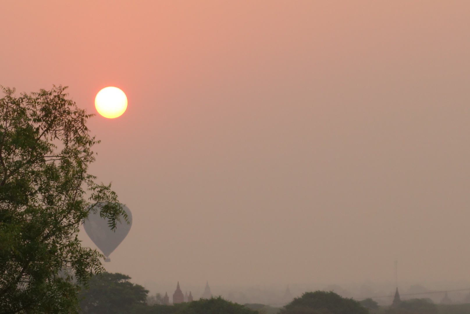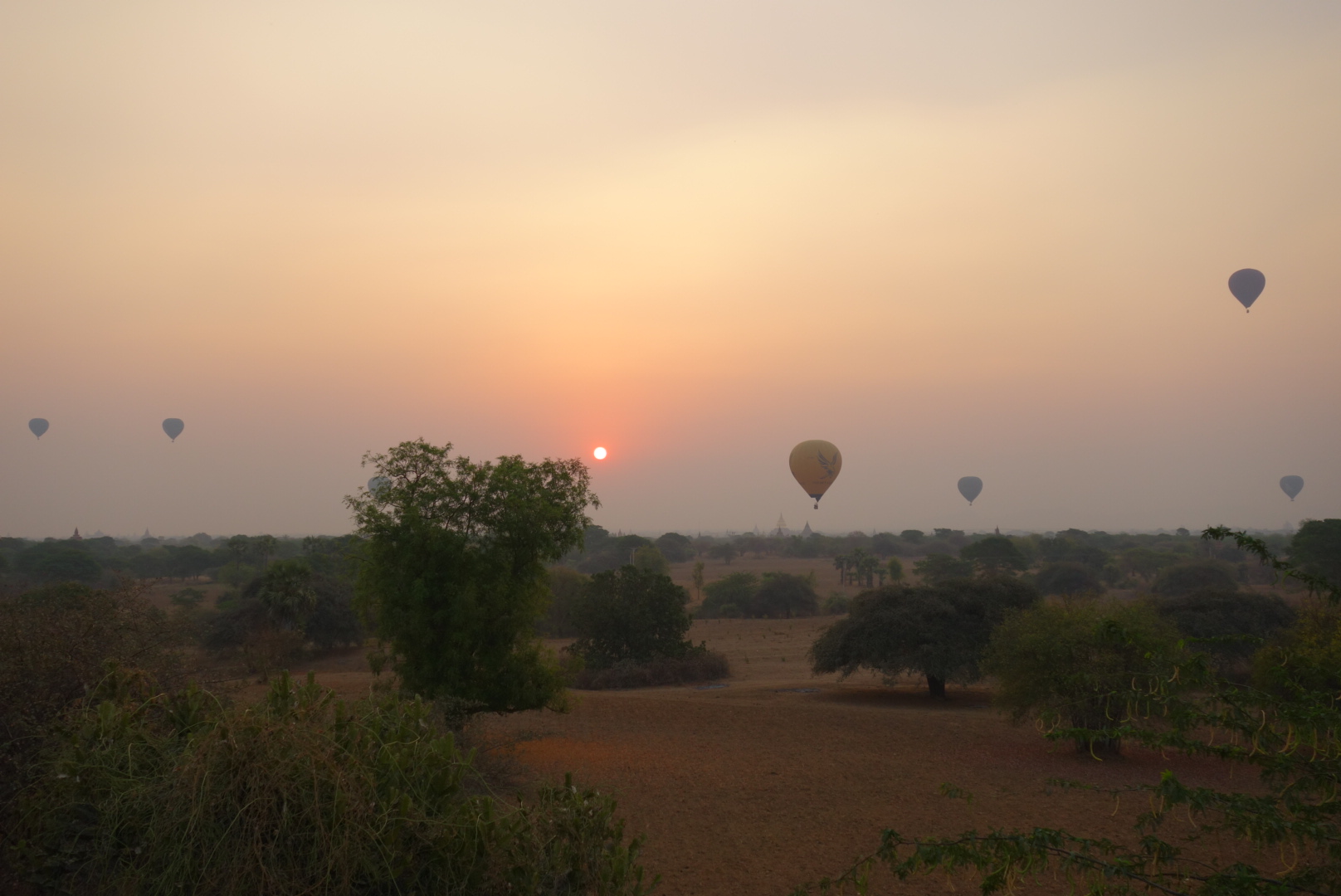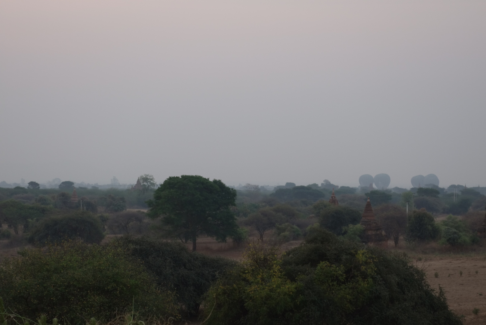 >>>>>เช้าวันนี้เราตื่นตั้งแต่ห้าโมงเช้า คือเมื่อคืนจะบอกว่าไม่ได้นอนเลยเกือบทั้งคืน ได้งีบก็ตอนจะสี่โมงเช้าแล้วเพราะว่าไอทั้งคืน บลรีบลุกขึ้นมาเดี๋ยวพลาดพระอาทิตย์ขึ้น แล้วรีบออกไปยังจุดชมวิวเมื่อวานที่เรากากบาทแผนที่เอาไว้แล้ว เรามุ่งหน้าไปยังปราสาทเจดีย์แห่งนั้น พอเราไปถึงกลายเป็นว่าเรามาช้ากว่าคนอื่น เค้ามานั่งจับจองพื้นที่กันแล้ว 3 คน และก็มาเพิ่มทีหลังเราอีก 2 คน เราสังเกตุการณ์นิดหนึ่งแล้วรู้สึกถึงความไม่เป็นมิตร เราจึงตัดสินใจย้ายฐานที่ตั้งใหม่ไปอยู่ที่ปราสาทเจดีย์อีกฝั่งที่อยู่ใกล้ๆกัน กลายเป็นว่าทีนี้มีแค่เราสองคนละ เรานั่งชมวิวพระอาทิตย์ขึ้นสักแปป ก็เริ่มปล่อยบอลลูนขึ้นฟ้า จุดนี้ความสวยของวิวไม่เท่าเมื่อวาน เพราะความสูงแค่ตึกสามชั้นเอง เรานั่งสักพักก็กลับเพราะห่วงนอนมากกว่า 555 เก็บแรงไปเที่ยวตอนบ่ายแดดร้อนๆอีก
