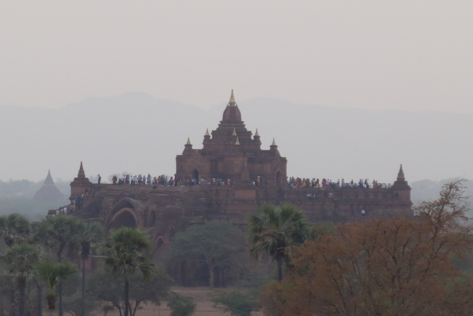 Wir machen es uns auf dem Dach bequem und beobachten die Menschenmassen, die sich auf dem etwa 800 Meter entfernten Tempel drängeln um einen Blick auf den Sonnenuntergang zu erhaschen.