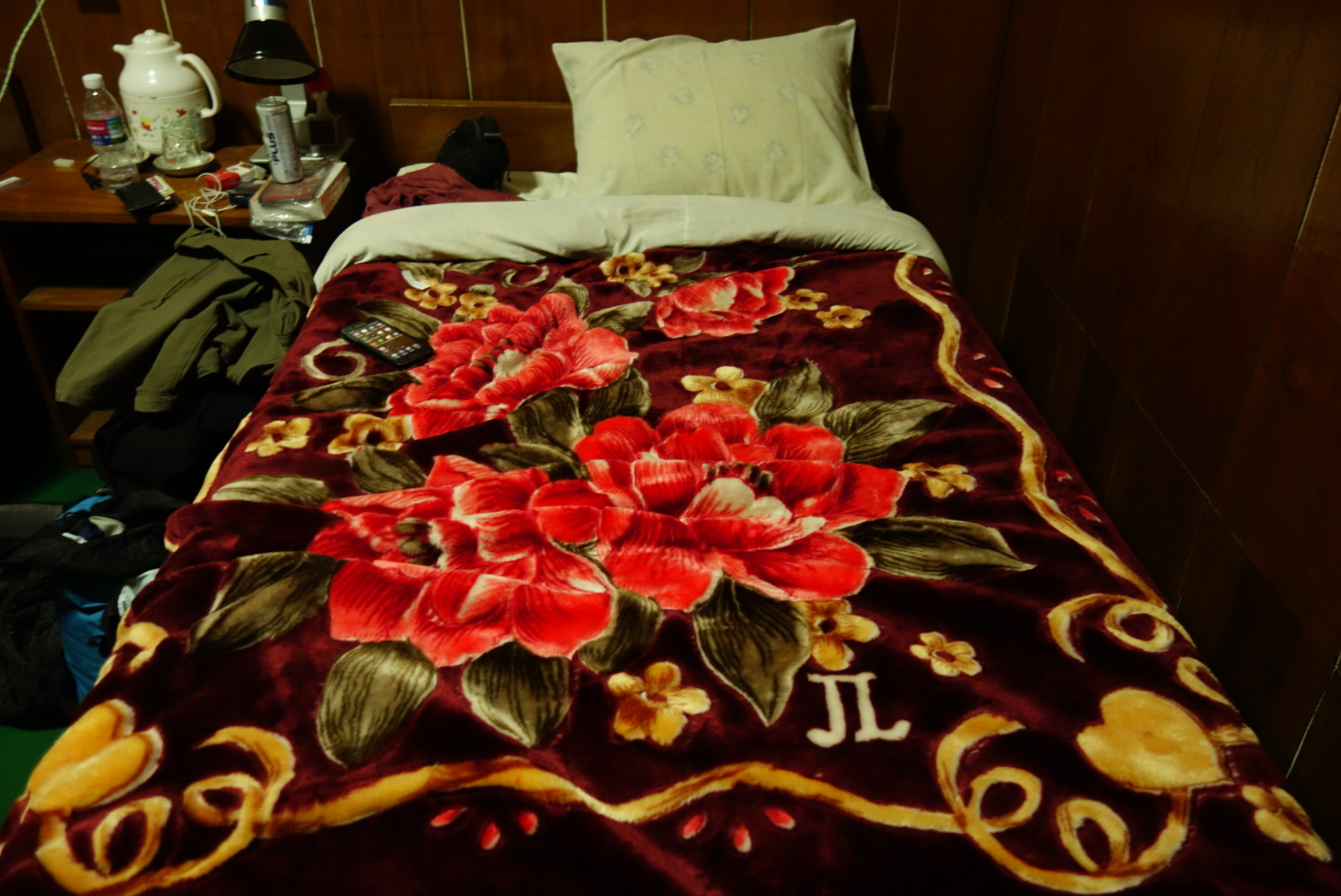 Der Empfang ist freundlich und das Zimmer, das wir bekommen ist mal abgesehen davon, daß wir gerade keinen Strom haben und ich „Pi“ auf meiner Bettdecke habe auch ganz Ok.