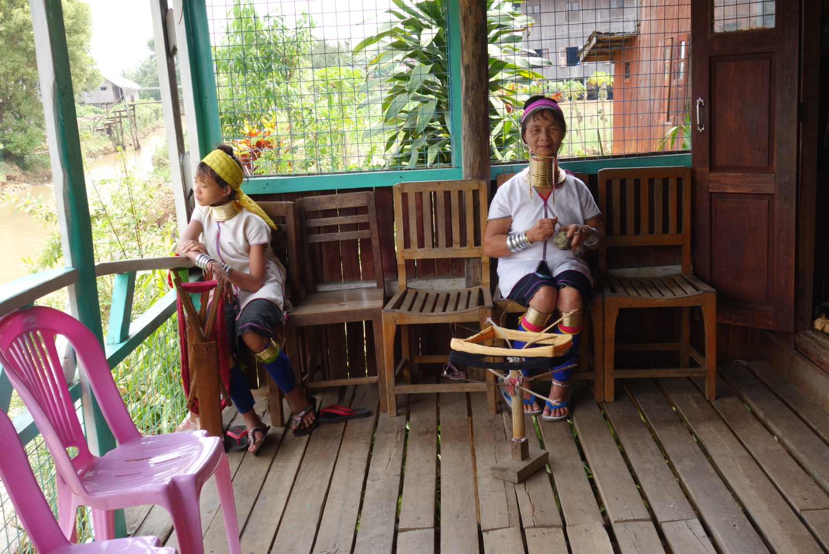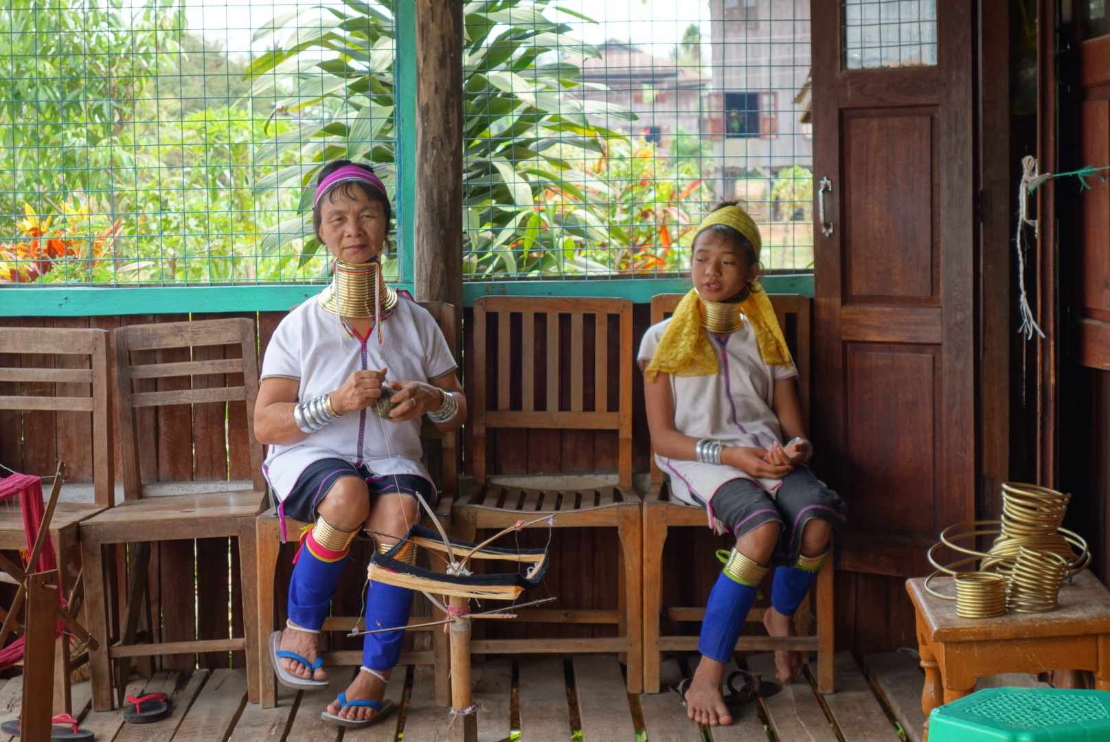 Das sind Frauen der Paduang, die aus Tradition  Messing-Spiralen um den Hals tragen.