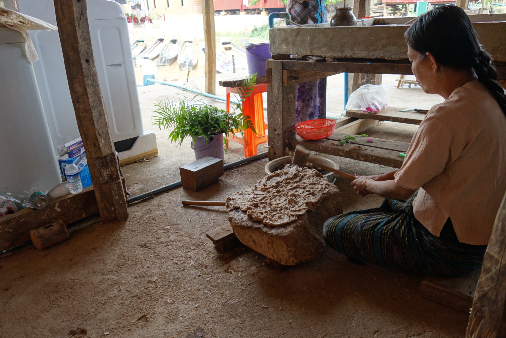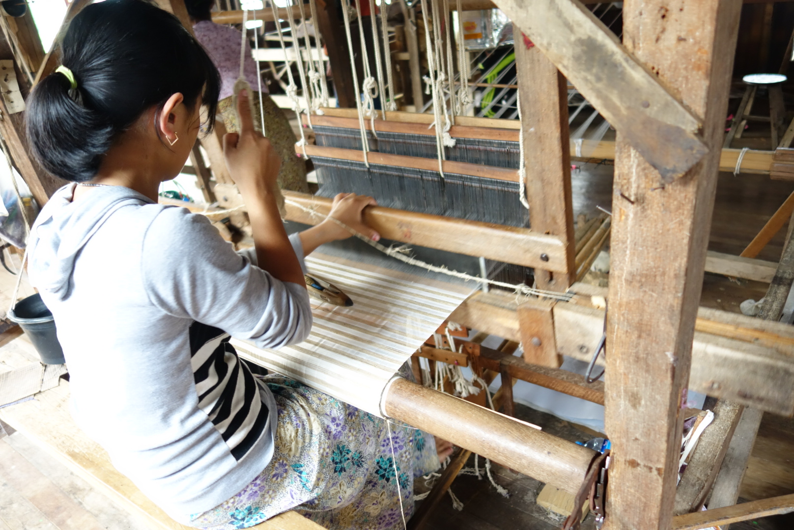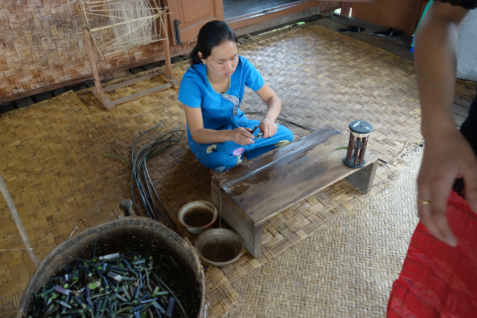 Begleitet vom ständigen Klappern der Webstühle wird uns also gezeigt wie der dünne Fäden aus den Stängeln der Lotuspflanze gewonnen wird, wo die Pflanzen angebaut werden und wie diese weiter verarbeitet werden.