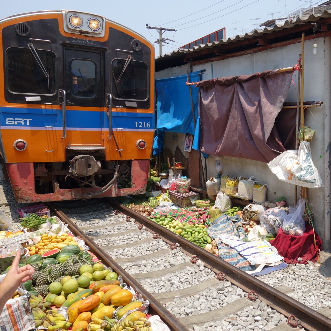 Wieder verbringen wir fast eine Stunde im Zug bis wir den berühmten „Mae Klong Railway Market“ erreichen.