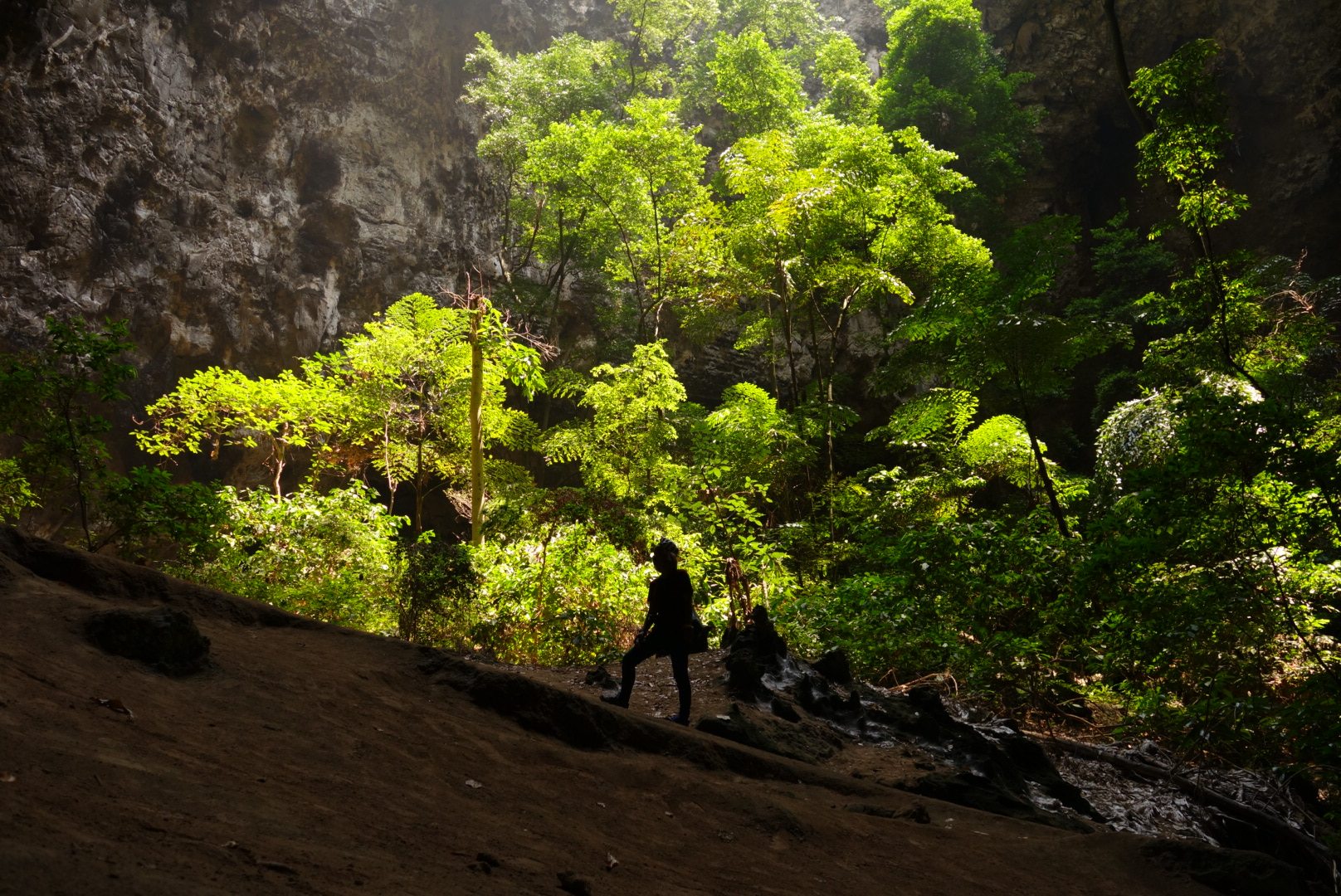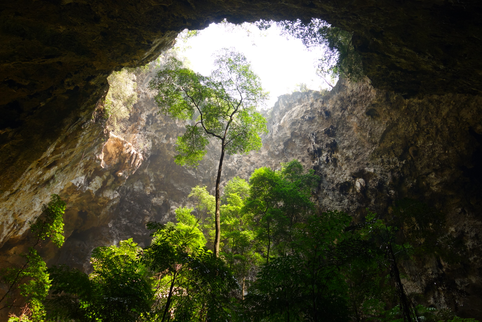 Die Höhle besteht eigentlich aus mehreren Höhlen beziehungsweise Einbrüchen, die nach oben offen sind und erlauben, dass das Sonnenlicht ganztägig die Höhle beleuchtet. Der Wanderweg führt nach Überschreiten eines Bergkammes erst wieder etwas hinab in eine erste größere, begrünte Höhle, die eher an eine Schlucht erinnert. In der nächsten größeren Höhle befindet sich ein kleiner Pavillon und an der Öffnung oben eine mit Büschen bewachsene „Todes-Brücke“, von der viele Wildtiere in die Höhle gefallen sein sollen.
