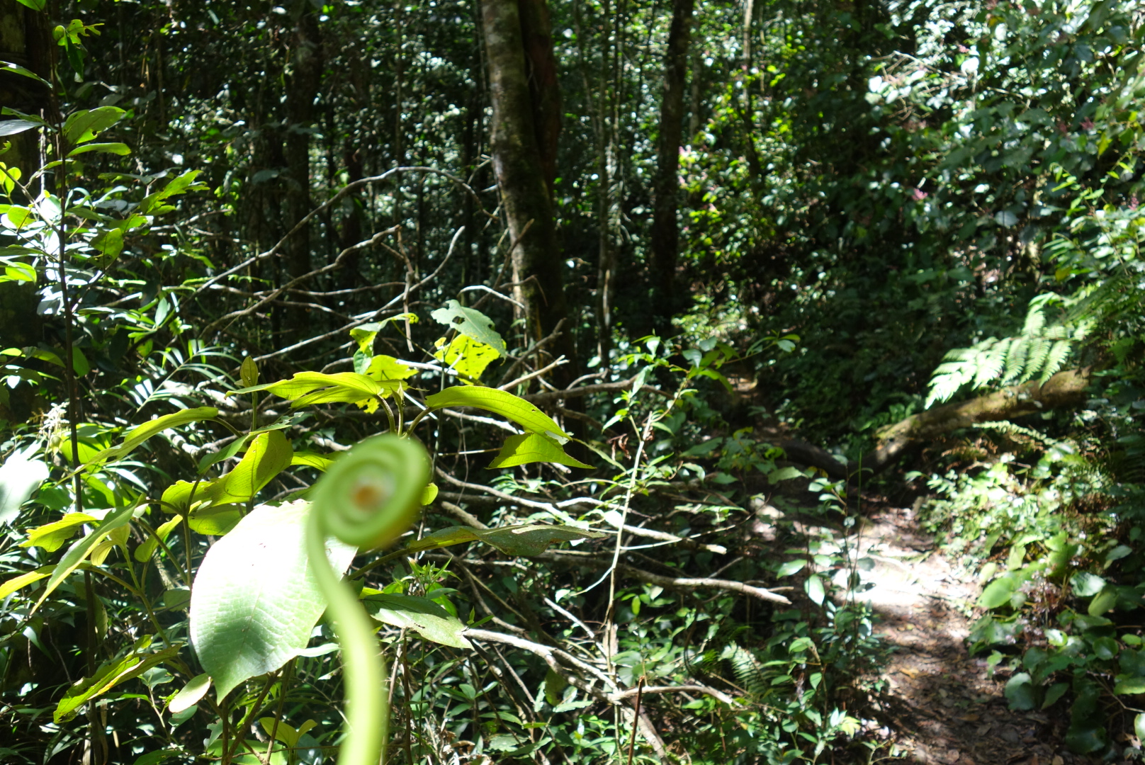 วันนี้แผนต้องเป็นไปตามแผน ต้องเดินสำรวจป่าให้ได้ เพราะที่นี่เราสามารถเดินป่าได้ด้วยตัวเองตามเส้นทางหมายเลขในแผนที่ ซึ่งเดินได้ไม่ยากเค้าจะมีป้ายบอกอยู่ตลอดเพื่อให้ให้เราหลงทาง แต่เดินป่าวันแรกก็หลงทางละ เพราะงงกับเส้นทางมาก มีหลายเส้นทางมากไม่รู้จะเดินไปเส้นไหนดี ถึงจะมีป้ายบอกก็เหอะ แต่จริงๆแล้วทุกเส้นทางส่วนมากจะสามารถเดินไปทะลุเข้าเส้นทางหมายเลขอื่นๆได้ด้วย เพราะเป็นป่าล้อมล้อมและก้วงใหญ่ เราหลงตรงทางเข้าป่าเพราะไม่รู้ว่าต้องเดินไปทางไหน ดีนะที่มีแผนที่ออฟลายทำให้เราเดินไปตามแผนที่ได้ถูกต้องและเจอทางเข้าจนได้ ช่วงแรกๆที่เดินก็ชิวๆสบายๆเป็นป่าในเมือง สลับกันเจอหมู่บ้านอยู่ด้านล่างเป็นช่วงๆ ส่วนยุงก็เข้ามาตอมตั้งแต่เริ่มประตูท่างเข้า คือคุณเดินเข้าเขตป่าเมื่อไหร่ยุงจะรอคุณอยู่ตรงนั้น ต้องพกสเปรกันยุงไปด้วยทุกที่ที่อยู่ในป่า พร้อมทั้งต้องใส่เสื้อแขนยาวขายาวปกปิดให้หมด เพราะเราจะไม่สามารถรับรู้ได้ว่ายุงมันกำลังไล่กัดเราอยู่ เนื่องจากเป็นยุงลายทั้งหมด นางจะเงียบมากแอบกัดแบบไม่รู้ตัว จะรู้ตัวอีกทีก็คันและมีตุ๋มละ. ซึ่งเวลาคันนี่แสบและรำคาญมาก เราเดินมาไกลพอควรหลงบ้างถูกบ้างในช่วงแรกๆ แต่ก็หาทางจนเจอ เมื่อเริ่มเข้าป่าลึกเรายิ่งรู้สึกเงียบสงบมากและต้นไม้ดูอุดมสมบูรณ์มากยิ่งขึ้นเรื่อยๆ ทางเริ่มต้องปีนขึ้นแล้วเป็นทางบันไดจากรากไม้ ทั้งปีนทั้งกระโดด หายใจหายคอแทบไม่ทัน มีอยู่ช่วงหนึ่งที่เราเดินปีนขึ้นตามรากไม้บรรไดอยู่นั้น เราเกิดได้ยินเสียงเหมือนเด็กร้องไห้อยู่ไกลๆ พากันสงสัยมีใครเอาเด็กมาปล่อยไว้ในนี้หรือเปล่า ในใจกลัวจะเป็นเช่นนั้น เพราะเสียงเด็กร้องดูยังเด็กมาก และร้องเหมือนโหยหวน เลยทำให้บลคิดอีกว่าหรือว่าเสียงแมวร้อง เราเดินไปเรื่อยๆเสียงจะร้องจะหยุดเป็นระยะๆและเราเข้าใกล้เสียงมากขึ้น จนทำให้มั่นใจว่าเสียงคนแน่นอน แต่เอ๋มีชาวบ้านมาสร้างบ้านอยู่นี่เหรอเด็กน้อยร้องเสียงลั่นป่า(จริงๆนะ) เมื่อเราเดินไปสักพักก็สังเกตุเห็นครอบครัวนักท่องเที่ยวฝรั่งสามคน พ่อ แม่และลูก โดยพ่อก็กระเตงลูกอยู่บนที่เปลนั่งด้านหลังของพ่อ และอีกมือก็ถือไม้คอยค่ำยันเวลาเดินลงทางชัน ส่วนแม่ก็เดินสะพายเป้ใบเล็กเดินตามดุ่มๆอยู่ด้านหลัง เราเงยหน้าขึ้นไปเจอพ่อทำหน้าดุๆเครียดและคงเหนื่อยหน่ายกับลูก แล้วเด็กน้อยก็ร้องเสียงดังขึ้นมาอีก พอหนูน้อยจากเห็นเราสองคนก็ร้อง“โอ๊ะโอ๋!“ แบบน่ารักอะนะ แถมยังยิ้มให้เราสองคนอีก พอพ่อเดินลงไปได้ไกลจากเราหน่