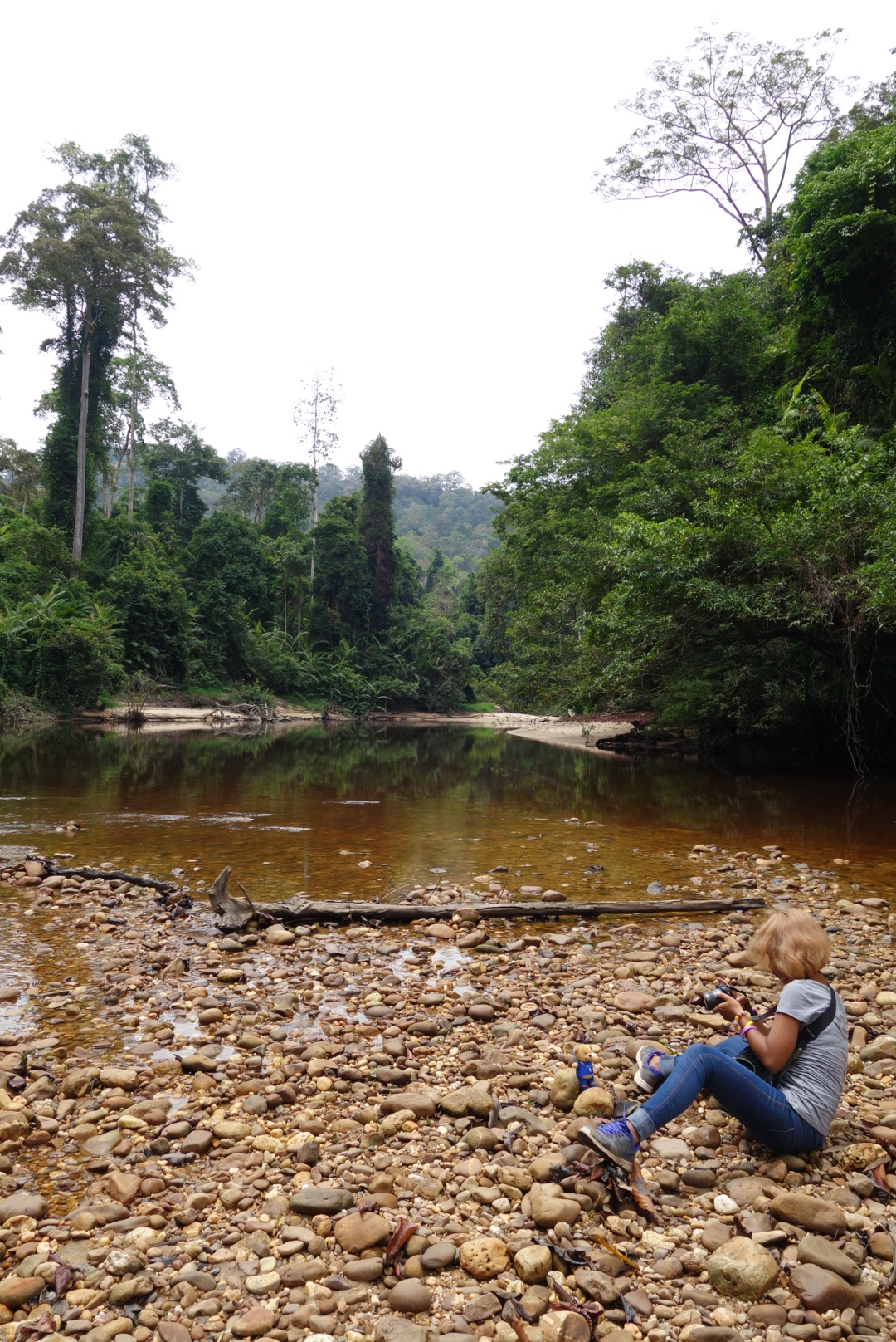 วันนี้บลกับบอสกะจะข้ามฝั่งแม่น้ำเพื่อเข้าไปสำรวจป่ากัน แต่เราเริ่มทริปช่วงบ่ายละ โดยเดินป่าเองไม่ได้จองทริปอะไร เพราะเราเพิ่งมารู้ทีหลังว่าที่เมืองนี้ไม่มีบริการตู้เอทีเอ็ม เรามีเงินในกระเป๋านิดหน่อยไม่พอที่จะจองทริปหรือทำอะไรได้มาก ทำให้เราจะทำโปรแกรมอื่นไม่ได้เลย เราเลยต้องทำทริปด้วยตัวเองแบบประหยัดๆ การที่เราจะข้ามแม่น้ำไปอีกฝั่งได้นั้นเราจะต้องไปนั่งเรือข้ามฝั่งคนละ 1 ริงกิต ใช้เวลาแค่นาทีเดียวก็ถึง เป็นทางเดอนขึ้นโรงแรมใหญ่ที่อยู่ใจกลางขุนเขา โรงแรมสวยและกว้างมาก ราคาค่อนข้างแพงเช่นกัน สิ่งแรกที่ต้องทำก่อนเดินสำรวจป่าคือต้องไปทำเรื่องเดินป่ากับเจ้าหน้าที่ก่อน ภายในบริเวณโรงแรมจะมีสำนักงานให้บริการสำหรับนักท่องเที่ยวอยู่ เราต้องไปที่นั่นก่อนเป็นอันดับแรกเพื่อไปซื้อตั๋วเข้าและเป็นการบอกเจ้าหน้าที่ให้ทราบด้วยว่าเราจะเข้าป่าไปเพื่อป้องกันการสูญหาย เนื่องจากเคยมีนักท่องเที่ยวหลายคนเดินเข้าไปในป่าแล้วหลงทางอยู่ในป่าเป็นอาทิตย์ เพราะที่นั่นเป็นป่าใหญ่ มีภูเขาหลายลูกแถมยังอุดมสมบูรณ์ไปด้วยสัตว์ป่ามากมายหลายชนิด ฉะนั้นเพื่อความปลอดภัยเราควรมีไกด์นำทางหากต้องการเดินป่าระยะไกล หรือบอกเจ้าของห้องพักและเจ้าหน้าที่ในแผนการณ์ของเราไว้ กำหนดเวลาในการเดินป่าที่แน่ชัดว่าจะเข้าไปในป่ากี่วัน หากเราไม่ออกมาตามกำหนดการณ์แล้วเจ้าของห้องพักและเจ้าหน้าที่จะได้รู้ตัวว่าเราหลงทางและควรออกไปตามหา เราเข้าไปหาเจ้าหน้าบอกรายละเอียดว่าวันนี้เราจะเดินป่าระยะสั้น ง่ายๆ พี่เจ้าหน้าที่ก็จะถามว่าจะเดินป่าหรือพักเที่ยวที่นี่กี่วัน เพราะพี่เค้าจะเก็บข้อมูลเราไว้เผื่อมีปัญหาใดใดด้านการสูญหายหรือหลงป่า เราบอกไปว่าจะอยู่ประมาณ 5 วัน แล้วพี่เจ้าหน้าที่ก็คิดค่าธรรมเนียมค่าเข้าป่าคนละ 10 ริงกิต และมีค่านำกล้องเข้าป่าอีกคนละ 5 ริงกิต ซึ่งก็ถือว่าไม่แพงนะสำหรับค่าธรรมเนียม ก่อนเริ่มเดินป่าเราหาซื้อน้ำในมินิมาร์ทในโรงแรมก่อน ซึ่งของที่นี่ค่อนข้างแพงมาก โดยเฉพาะยากันยุงแพงสุดๆ สเปร์กันยุงขวดเล็กราคาประมาณ 25-35 ริงกิต หรือราวๆ 250 บาทขึ้น เราเลยตัดสินใจไม่ซื้อเพราะแพงเกินไป ที่ประเทศไทยแค่ 30-60 บาทเองมั้งถ้าจำไม่ผิด แต่ไม่เกิน 100 บาทแน่นอน. การจะเดินป่าที่มาเลเซียนั้นคุณจำเป็นอย่างมากจะต้องมีสเปรย์ป้องกันยุง และต้องสวมเสื้อผ้าให้มิดชิด แขนยาวขายาว เพราะยุ่งจะติดตามคุณตลอดทุกจุดทุกมุมโดยที่คุณไม่รู้ตัว เดินออกจากป่าถึงจะเห็นว่ามีรอยตุ๋มแดงเต็มแขนขา แสบตัวไปหมด 