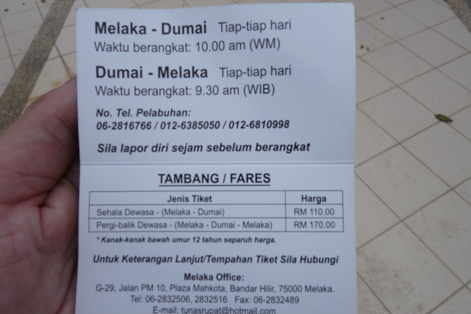 In diesem Finde ich zu Dumai allerdings nur eine Information, die ich schon kenne: „Von Dumai gibt es eine Fähre nach Malaysia. “
