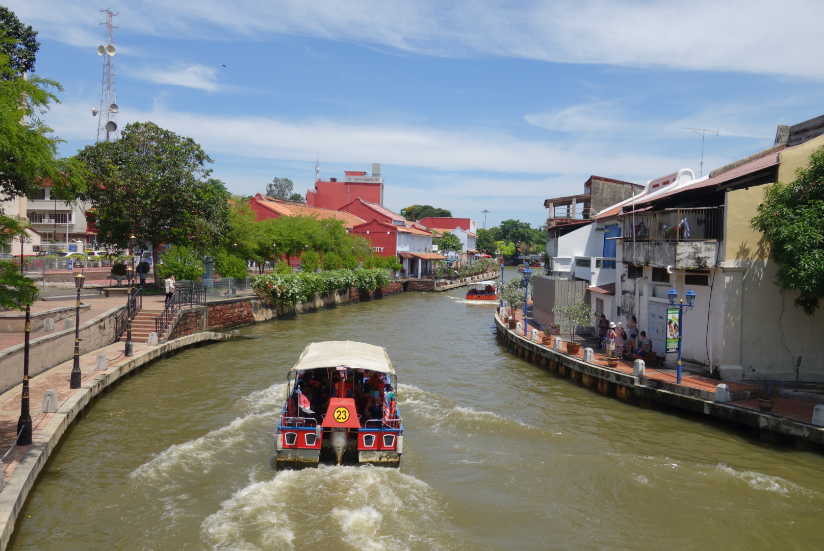 วันนี้บอสเกิดอยากลองนั่งเรือรอบเมือง เอาจริงๆคือเดินชมก็ได้นะ แต่บอสอยากได้ฟิวกลางน้ำกับนักท่องเที่ยวคนอื่นๆเต็มเรือ ค่าเรือก็แอบแพงขึ้นเพราะเป็นช่วงวันหยุดพิเศษของบ้านเมืองเค้า เอาสิแพงก็สู้บอสยอม เมื่อจ่ายเงินค่าตั๋วเสร็จก็ต้องรีบวิ่งไปขึ้นเรือเนื่องจากผู้โดยสารคนอื่นๆรอเต็มเรือและอยากจะออกเต็มแก่ ทุกคนมองมาที่เราสองคนด้วยความกดดัน เมื่อเรือเริ่มแล่นแรกๆก็ยังไม่มีอะไร เรือแล่นไปอย่างช้าๆเพื่อให้นักท่องเที่ยวได้ชมบรรยากาศข้างทาง เมื่อเรือเริ่มเข้าบริเวณจุดท่องเที่ยวก็จะเห็นความสวยงามของตึกราบ้านช่อง และความอาร์ตของเมือง ทำให้เราตัดสินใจเมื่อเรือวนรอบเมืองและเลี้ยวกลับ เราจะเดินกลับมาที่จุดที่น่าสนใจที่เรือผ่านใหม่เพื่อขอถ่ายรูปเก็บไว้เป็นที่ระลึก เนื่องจากการนั่งเรือไม่มีโอกาสได้ถ่ายรูปเลย เพราะนั่งตรงกลาง ถ่ายติดแต่หัวผู้โดยสารคนอื่น เลยไม่ถ่ายดีกว่า นั่งมองผ่านๆ เมื่อเราลงจากเรือเรามุ่งหน้าไปยังร้านอาหารเมื่อตอนที่เรือวิ่งผ่านเพราะบอสบอกจะมาทานอาหารที่ร้านริมสะพาน ตรงสตีทอาร์ต จากนั้นเราเดินริมลำคลองไปเรื่อยๆโดยเลือกเดินคนละฝั่งเพื่อเก็บภาพของกันและกันในฝั่งตรงข้าม แต่ก็ไม่เวิร์คเท่าไหร่เพราะกล้องซูมได้ไม่ดีเท่าไหร่ ได้แต่ภาพระยะไกลตัวคนเล็กๆ55 เมื่อเดินจนรู้สึกร้อนและเหนื่อยก็พากันเดินกลับลัดเลาะไปตามทางเรื่อยๆ เย็นนี้เราต้องตัดสินใจแล้วว่าจะไปอินโดนีเซียด้วยวิธีไหนและข้ามไปฝั่งไหน เพราะจากข้อมมูลที่ได้มานั้น อินโดนีเซียนี่ไม่ต่างจากไทยเลย คือขูดรีดเงินนักท่องเที่ยว ตำรวจเจ้าหน้าที่ก็กินเงินสินบนใต้โต๊ะกันแบบด้านๆ แท็กซี่ก็ออกจะมหาโหดกับนักท่องเที่ยวเหลือเกิน สุดท้ายเราตัดสินใจจะไปขึ้นเครื่องที่สิงคโปร์ จึงเริ่มจองตั๋วแต่ก็ไม่ง่ายเลยกว่าจะจองได้แทบไม่ได้หลับนอนกันเลย