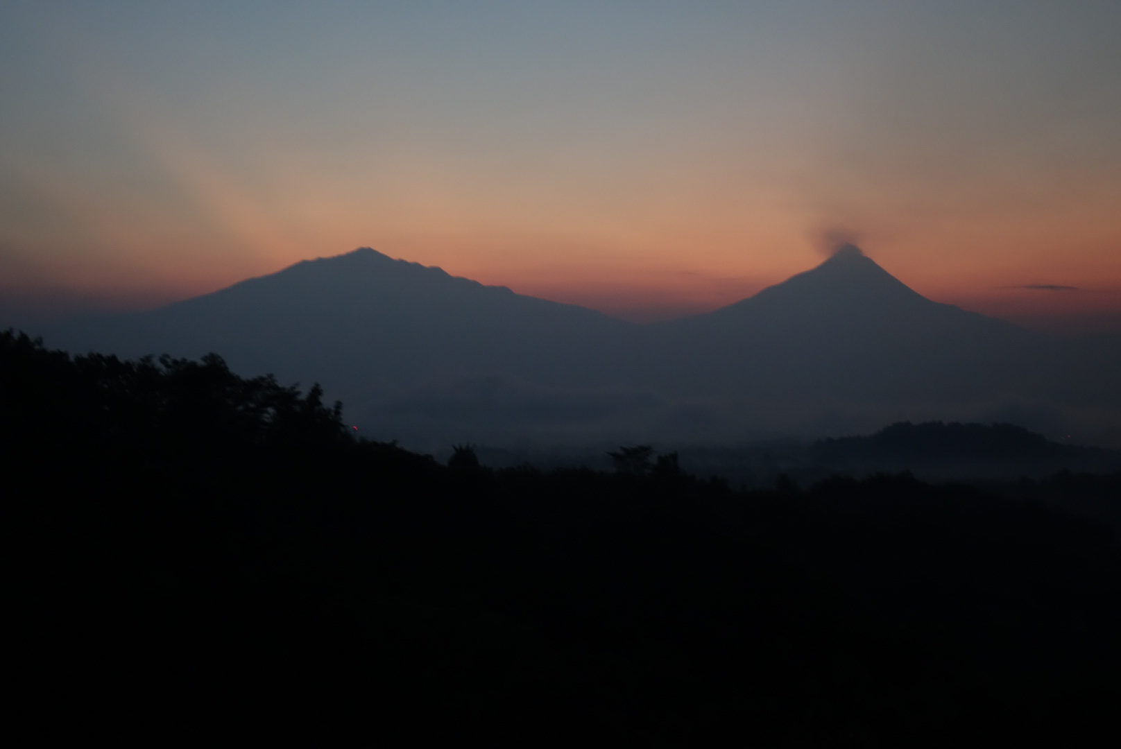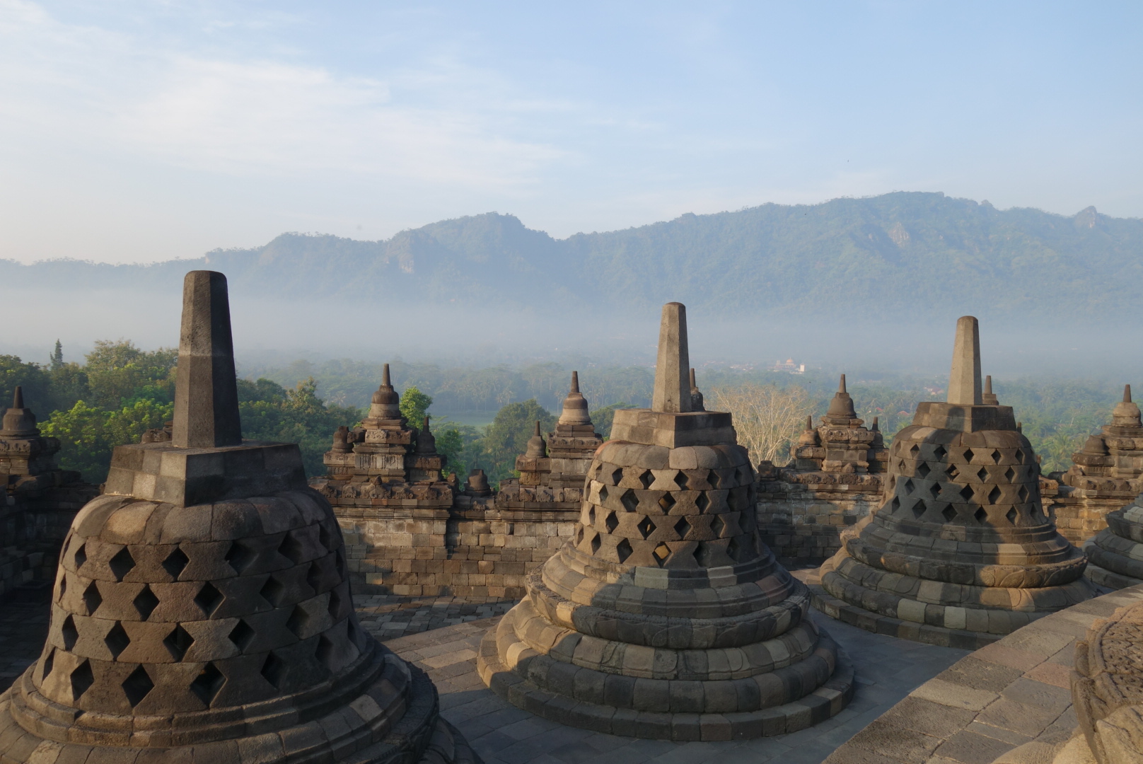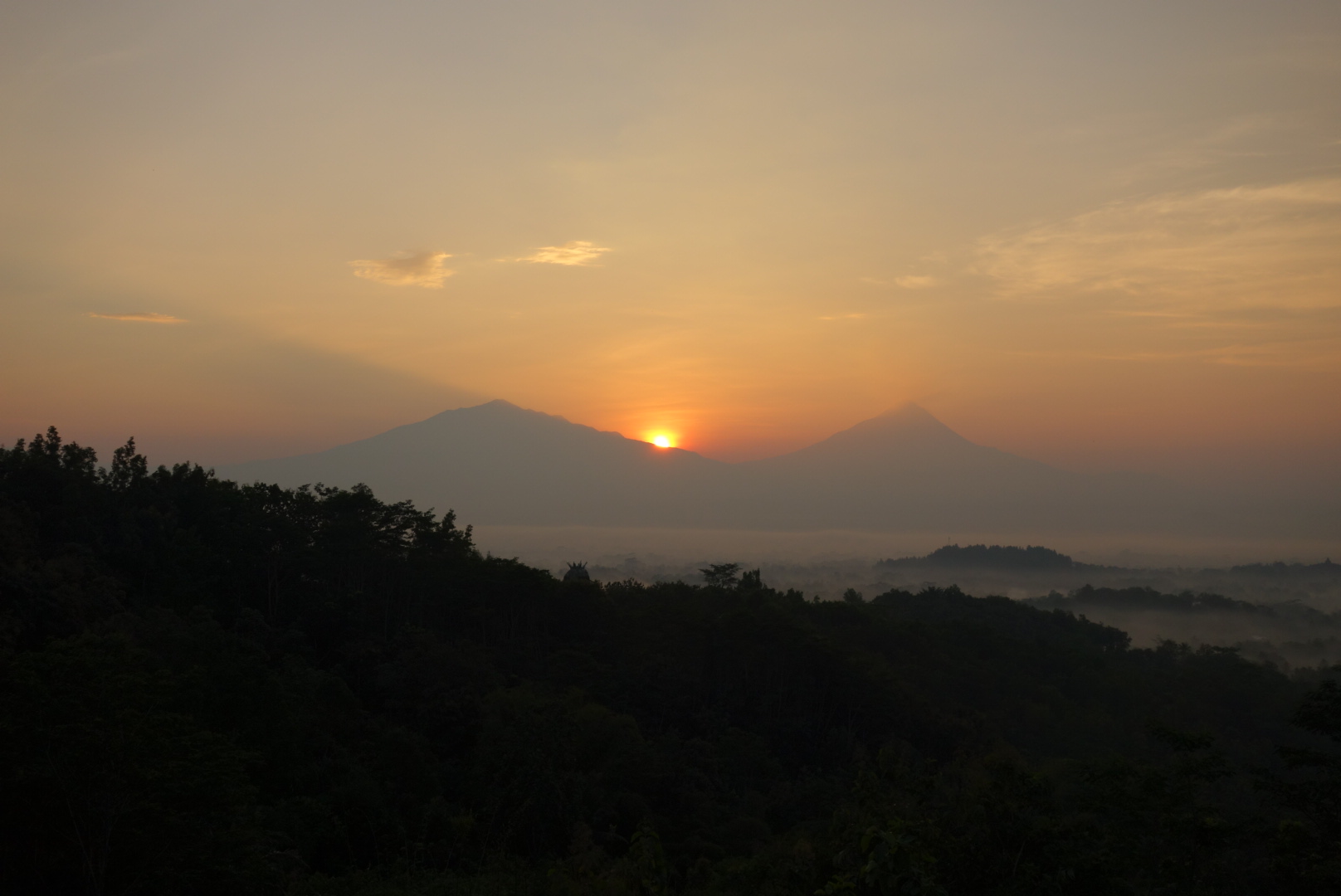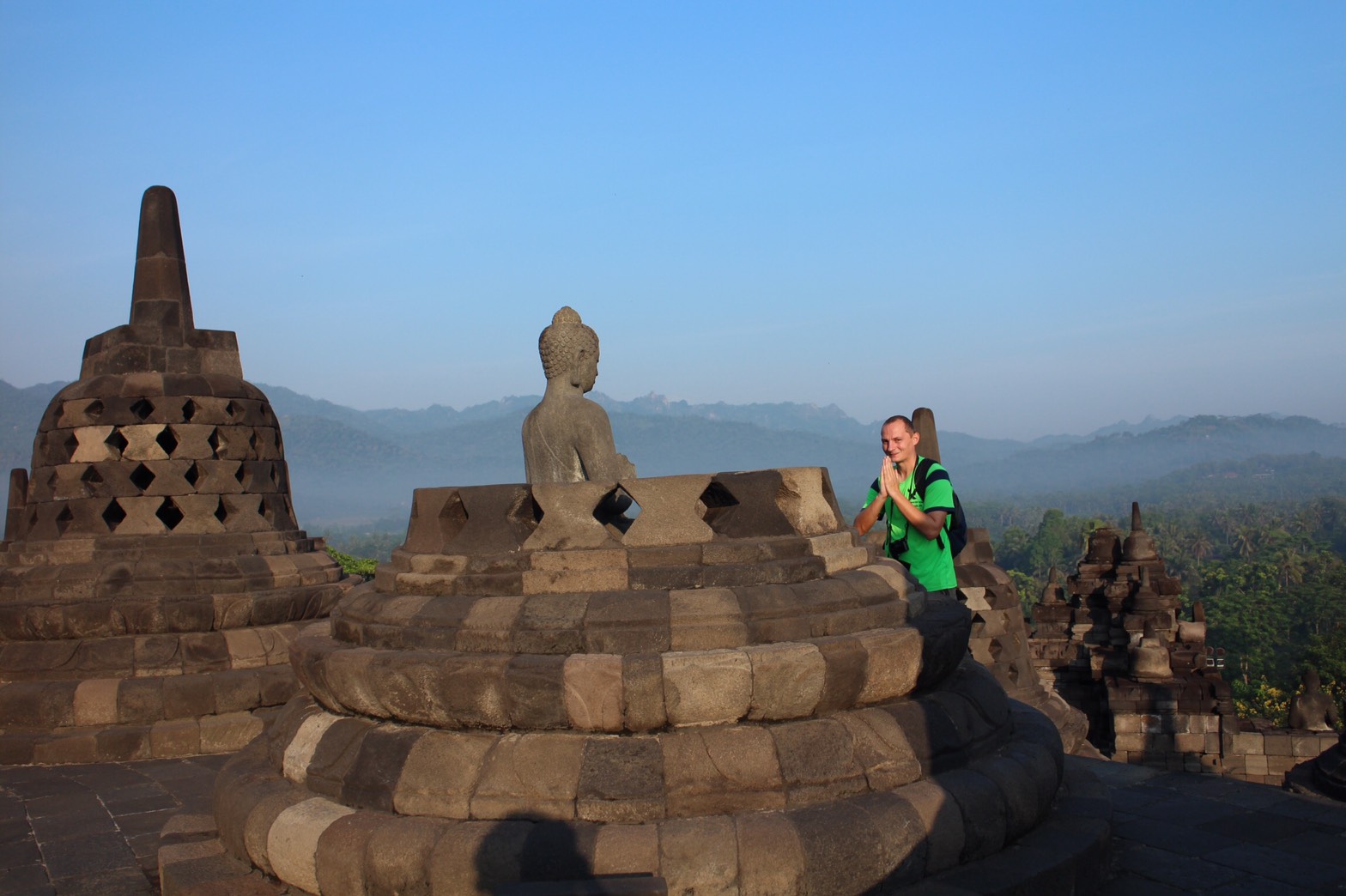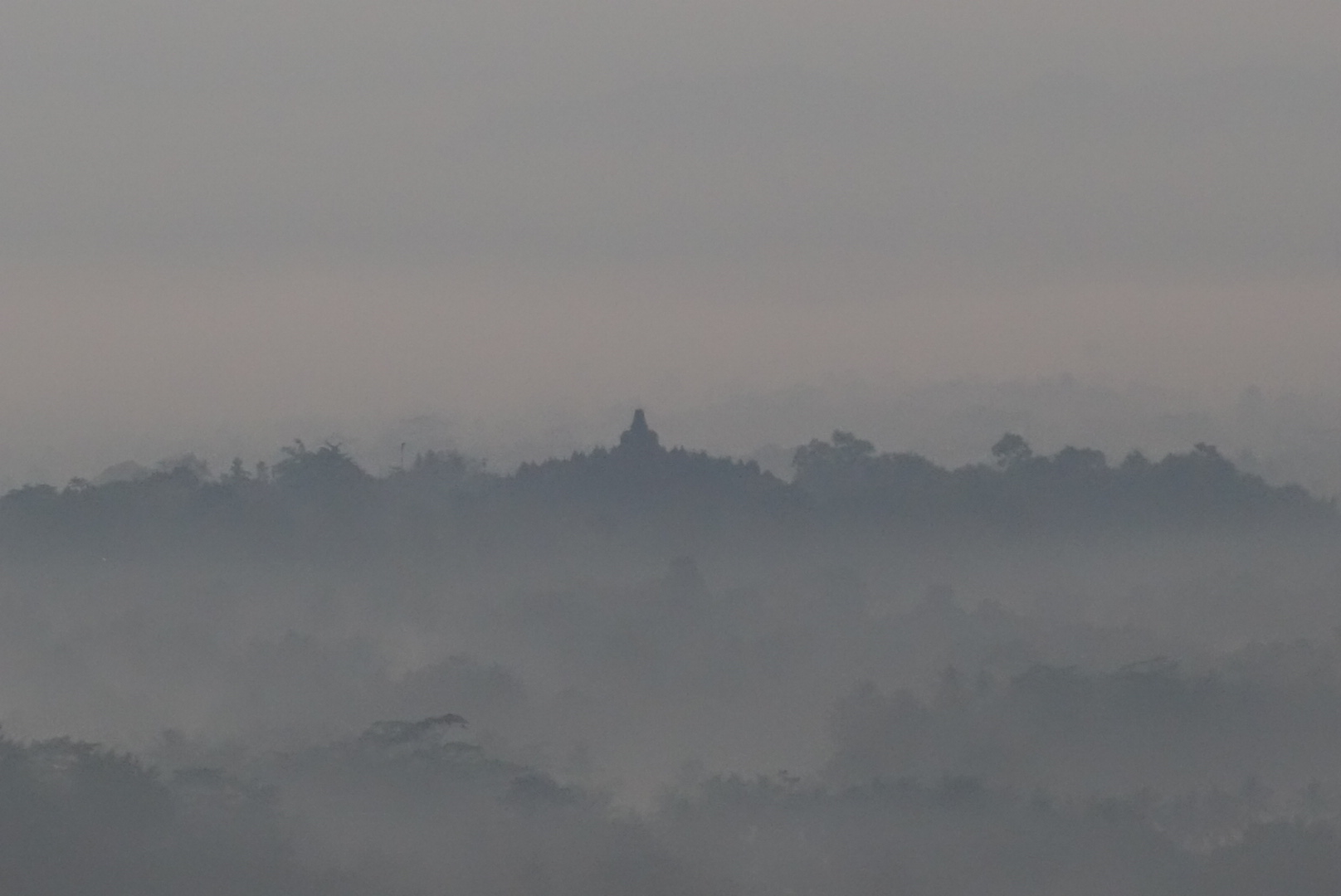Dann heißt es warten um etwa eine Stunde später beim Abstieg zufrieden festzustellen, daß sich das frühe aufstehen doch gelohnt hat weil der Blick zum Merapi wärend hinter dem Vulkan langsam die Sonne aufgeht wärend in der Ebene davor noch aus dem Grün der Bäume die Nebelschwaden aufsteigen und ganz klein mittendrin Borobudur zu swhen ist einfach toll ist, sogar für einfachen Morgenmuffel wie ich einfacher bin………Aber seht selbst.