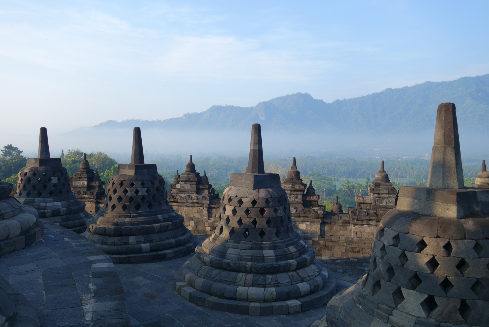 ในตอนเช้ามืดเวลา ตีสาม รถมารับเราที่หน้าประตูบ้านเช่นเคย คนขับพาเรามุ่งหน้าไปยังจุดชมวิว Borobudur Nirwana Sunrise เราใช้เวลาเดินทางหนึ่งชั่วโมงจากเมือง การเดินทางสบายๆเพราะมีแค่เราสองคนหลับอย่างเดียวเลย เมื่อถึงคนขับก็แนะนำเราว่าต้องทำอะไรยังไงเพราะเค้าจะไม่ขึ้นไปด้วยแต่จะรอที่รถ ซึ่งที่จุดชมวิวแห่งนี้ก็มีนักท่องเที่ยวมายังที่นี่มากมายพอสมควร เราต้องซื้อบัตรเข้าอีกคนละ 30000Rp. จากนั้นก็เดินขึ้นไปไม่ไกลนักพอหอบนิดหน่อย ผู้คนยืนรอชมพระอาทิตย์ขึ้นกันมากหน้าหลายตา ระหว่างทางขึ้นก็จะมีร้านขายขนมกาแฟไว้ให้บริการอยู่หลายจุด เราหาที่นั่งเหมาะๆ (หายากนะเพราะพื้นที่จำกัดกับคนจำนวนมาก) เราได้นั่งรอนั่งมองแสงอาทิตย์เริ่มสว่างขึ้นทีละน้อยทีละนิด เราสามารถมองเห็นภูเขาไฟเมอราพีจากมุมนี้ด้วยนะ แต่เช้านี้ฟ้าไม่ค่อยสู้ดีเท่าไหร่แต่ก็ยังพอเห็นความสวยงามอยู่ข้างหน้า ยืนดูสักพักพอแสงจ้าเวลาถึง เราก็ต้องลงไปหาคนขับเพื่อไปยังวัดบูโรพุทโธต่อ เพื่อรีบไปดูแสงเช้าที่วัดน่าจะสวยงามกว่า