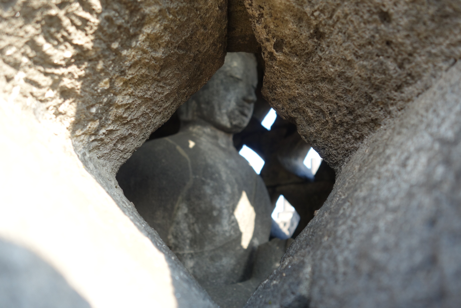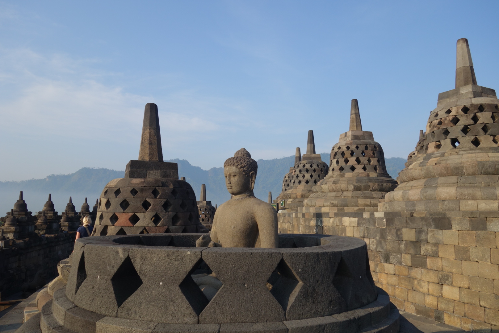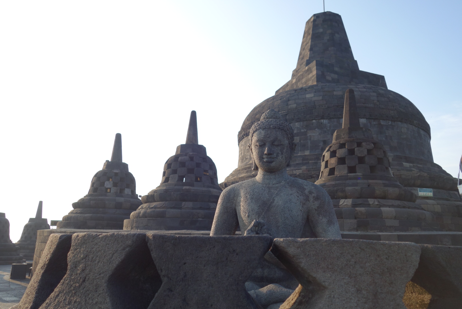 จากนั้นคนขับพาเราขับไปไม่ไกลก็ถึงวัดบุโรพุทโธ เราลงจากรถคนขับพาเราเดินเข้าไปและซื้อตั๋วให้ก่อน ก่อนหน้านี้คือตกลงกันในรถแล้วว่าจะจ่ายตั๋วเองหรือจะให้เค้าเก็บทีเดียว เราบอกให้เก็บทีเดียวไปเลย รวมในบิล พี่เค้าดูจริงใจและซื่อสัตย์ดีชอบ แล้วพี่เค้าก็พาเดินไปที่เคาเตอร์โรงแรม แล้วก็จัดการซื้อตั๋วให้เราสองคนโดยพี่เค้าจ่ายไปก่อน จากตรงนี้พี่เค้ายื่นตั๋วให้เราเข้าไปด้านในพร้อมกับรับน้ำดื่มฟรี ส่วนพี่คนขับก็รอในรถ นัดแนะกันเรียบร้อยว่ารอตรงไหน เรารับชากับกาแฟมา บอสนั่งทานอย่างสบายใจ แต่บลอยากไปเร็วๆเพื่อรับวิวแสงอาทิตย์ยามเช้าเพราะมันจะสวยมากและที่สำคัญไม่ร้อนด้วย บอสนี่ตลอดเลยสายชิว เราก็ต้องรอตลอด เมื่อเริ่มสตาร์ทออกมุ่งหน้าเข้าหาวัด บลนี่วิ่งอย่างเดียวเลยกลัวพระอาทิตย์จะขึ้นสูงกว่านี้ เดี๋ยวจะไม่ได้เห็นความสวย แต่ระหว่างเดินไปที่วัดนั้นก็จะมีคนมาขายของฝากให้เรา เราก็ปฏิเสธอย่างเดียว แต่บอสสิไม่อยากให้เค้าเสียน้ำใจเค้าอุตส่าห์ตามตื้อ ถามชื่อเสียงเรียงนาม จนพี่คนขายก็บอกว่าเค้าชื่อนี่นะ จำเค้าไว้นะ ถ้าลงมาเดี๋ยวเราค่อยดูของก็ได้ ในใจบลคิด „จะได้เจอเหรอ“ เมื่อถึงวัดไม่สนใจอะไรเลยมุ่งหน้าปีนขึ้นบันไดอย่างเดียว แต่ระหว่างที่ขึ้นก็ชำเลืองเห็นว่าอลังการจริงๆ แต่ต้องรีบวิ่งขึ้นบรรไดเพื่อไปยังด้านบนสุดก่อนแล้วค่อยไล่ดูลงมาทีละขั้น เป็นไปตามคาด เช้าสุด บนสุด คนน้อย อากาศดี แสงสวย วิวสวย พร้อมฉากวัดอลังมาก เราเดินวนอยู่ด้านบนสองสามรอบดูวิวสวยๆพร้อมกับมุมสวยๆของวัด ที่นี่น่าสนใจมาก พระพุทธรูปตั้งอยู่ด้านในเจดีย์ที่ครอบเอาไว้ แต่เมื่อส่องดูพระพุทธรูปด้านในปรากฏว่าหัวของพระพุทธรูปหายไปเยอะมาก บางจุดก็มีพระพุทธรูปนั่งอยู่บนฐานที่ไม่มีฝาครอบ บางองค์ก็นั่งเรียงรายอยู่ริม หรือมุม บ้างไม่มีหัว บ้างมีหัว ผสมกันไป รอบๆวัดจะมีศิลปะฝาผนังหินแสดงประวัติต่างๆเป็นรูปภาพหินแกะสลัก สวยงาม ภาพยังคงชัดเจน มีการนำชิ้นส่วนภาพหินอิฐมาวางทาบในส่วนที่พุพัง ทำให้ภาพสลักหินดูแปลกตา สลับรูป ลวดลายไปบ้าง แต่ทุกอย่างยังดูล้ำค่าและโบราณ ซึ่งแตกต่างจากปราสาทที่กัมพูชาที่มีการบูรณะใหม่เยอะมากและส่วนมากคือการสร้างจากของใหม่ทั้งหมด แต่ที่นี่เค้าจะใช้หินของเก่าที่ยังหลงเหลืออยู่ตามอาณาบริเวณวัดเอามาปรับปรุงแก้ไข ต่อเติม เราเดินไล่ลงที่ละชั้น ถ้าจำไม่ผิดน่าจะมี 7ชั้นนะ เหมือนสวรรค์ชั้น7อะ แต่ละชั้นจะคล้ายๆกันแต่รายละเอียดต่างกัน เราสนุกกับการเดินสำรวจที่นี่มาก น