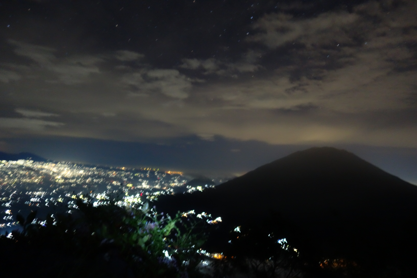 Man sieht in der Ebene die Lichter der Zivilisation, etwa 200 Meter unter meinen Füßen türmen sich dichte Wolken, die wegen des starken Windes regelrecht brodeln und immer in Bewegung sind.