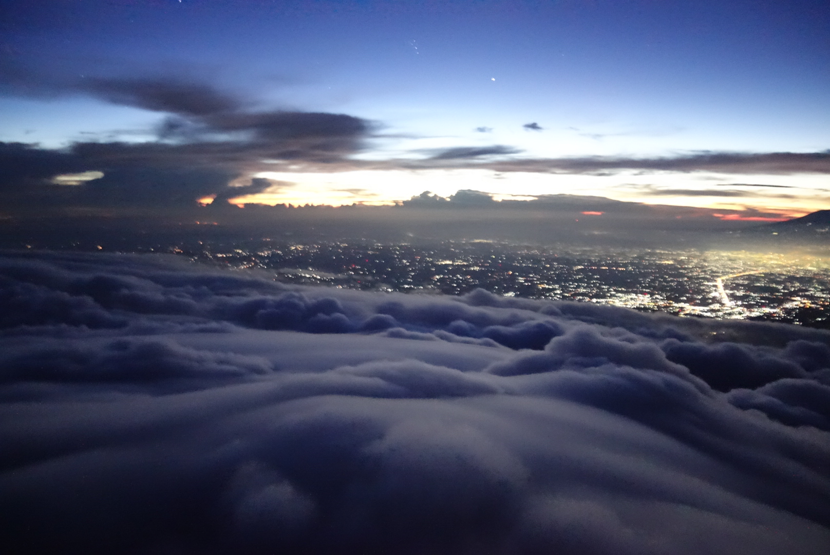 Unter uns die Lichter die vielen Städte und Dörfer und natürlich wie für Java üblich Vulkane.