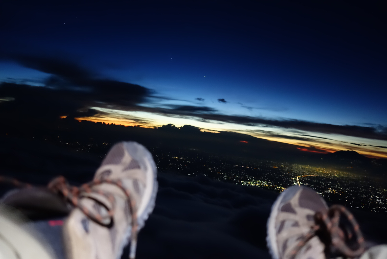 วันที่ 15 มิถุนายน 2559 ได้เวลาเดินเขากลางดึกแล้ว เมื่อถึงเวลาเที่ยงคืนกว่าๆ ไกด์เรียกเราให้ออกมาด้านนอก อากาศตอนนี้ก็เริ่มหนาวและเย็นแล้ว เสื้อผ้าที่เราใส่มาเตรียมพร้อมตั้งแต่มาจากที่โฮมสเตย์ของปีเตอร์แล้ว ไม่ยักจะร้อนนะ อุ่นดี จากตอนนี้กลุ่มเรามีกัน 8คน และมีไกด์คอยประกบเราอยู่สามคน แต่ละคนจะเลือกเดินประกบเป็นคู่ๆ ถ้าใครมาเดี่ยวเค้าก็ต้องเดินไปอยู่กับใครก็ได้อิสระ แต่เราก็ต้องติดไกด์ไว้เป็นดีที่สุด ช่วงแรกเราเดินประมาณหนึ่งกิโลกว่า เพื่อไปยังเชิงจุดสตาร์ท New Solo แค่เดินบนถนนคอนกรีตในหมู่บ้านไต่ขึ้นทางชันนิดหน่อยแค่นี้ก็เหนื่อยแล้ว แต่ก็ยังพอมีแรง ไกด์ที่คอยเดินเกาะติดเรานั้นคือพี่ซาพิศ พี่เค้าคุยดี ชวนคุยนั่นนี่ แต่บลถ้าเหนื่อยก็คือเงียบเลยไม่ค่อยจะอยากคุยเท่าไหร่ บวกกับมันมืด มีแต่แสงไฟจากไฟฉายที่ส่องจากหัวของเรา บลเดินแบบตัวเปล่า มีแค่กระเป๋าใบเล็กๆสะพายหลังเพื่อนำหนูนักฟุตบอลหมี ปีโตและเจอรันถูทไปเที่ยวด้วย ซึ่งก็ไม่ได้หนักอะไรเลย อารมณ์การปีนเขาตอนมืด คือครั้งแรกในชีวิต แต่ระหว่างทางคอนกรีตนี่ยังไม่มีอะไรมาก เมื่อเราถึงจุดสตาร์ทที่ New Solo ไกด์ก็ให้เรานั่งพักเหนื่อยและเตรียมพร้อมจิบน้ำทานอาหารนิดหน่อย จากตรงนี้ก็เห็นมีหลายคนที่หอบเหมือนกัน เมื่อเรานั่งพักหนุ่มเยอรมันที่เดินทางมาในรถกับเราก็มีปัญหานิดหน่อยคือไม่ได้เอาไฟฉายมา ไกด์เลยต้องหามาให้ เป็นไฟฉายถือ และที่สำคัญอีกอย่างในการปีนเขาซึ่งจะลืมไม่ได้คือน้ำ เค้าลืมซื้อน้ำมาจากด้านล่าง คือจากตรงนี้เราเดินมาไกลจากหมู่บ้านแล้ว จะกลับไปซื้อก็ไม่ได้เพราะมันจะเสียเวลา เมื่อเห็นเช่นนั้นด้วยความที่บลเป็นคนที่มีน้ำใจ (55 สร้างภาพ ) เลยบอกบอสให้เอาน้ำให้เค้าขวดหนึ่ง หนุ่มชาวเยอรมันก็แสดงอาการเกรงใจออกมานิดหน่อย แต่เราก็บอกว่าไม่เป็นไรเพราะเราเตรียมน้ำมาสามชวด ซึ่งบลคิดว่าปกติบลก็ไม่ค่อยจะกินน้ำเยอะอยู่แล้ว บวกกับบอสนี่เป็นคนที่มีความอดทนสูงมาก และไม่ค่อยเปลืองน้ำเท่าไหร่ บลเลยตัดสินใจแบ่งให้เค้าไปขวดเล็กหนึ่งขวด. ให้เค้าไปจัดสรรการดื่มน้ำแบบประหยัดของตัวเองเอา ไม่รู้จะไปรอดไหมเพราะน้ำแค่ขวดเล็กกับการเดินทางปีนเขาขึ้นและลงเป็นระยะเวลา 7ชม.เป็นอะไรที่ท้าทายน่าดู ซึ่งอีกเหตุผลหนึ่งเค้าก็เป็นคนประเทศเดียวกันกับบอสก็ควรจะช่วยเหลือและแบ่งปันกันไป ซึ่งเค้าก็ขอบคุณ ระหว่างนั้นเค้าก็ซดน้ำไปเยอะ ลดลงเกือบครึ่งขวด. แหม่ม!คิดในใจกะจะไม่ประหยัดน้ำตอนเดินขึ้นเขาเลยเหรอ ก็ได้แต่หวังว่าเค้าจะไปรอ