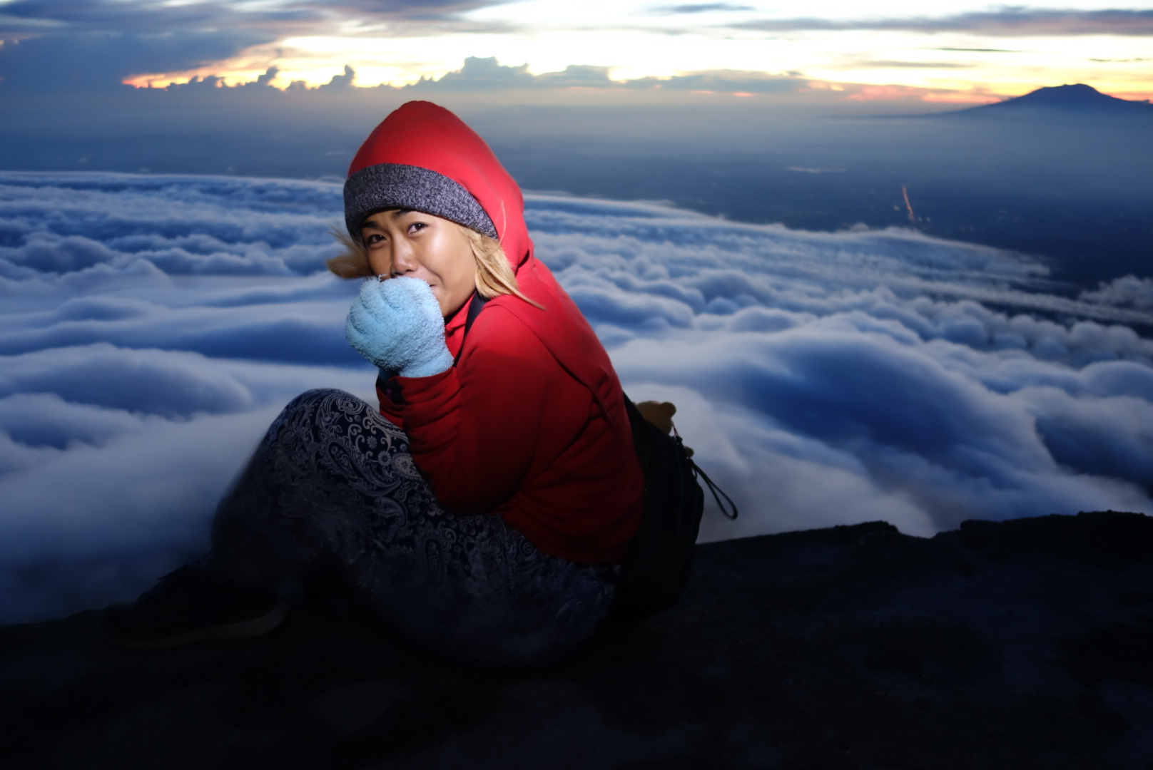 Hinter mir der dampfende Krater des Gunung Merapi und neben mir Bonny mit der ich frierend diesen einzigartigen Moment geniße.