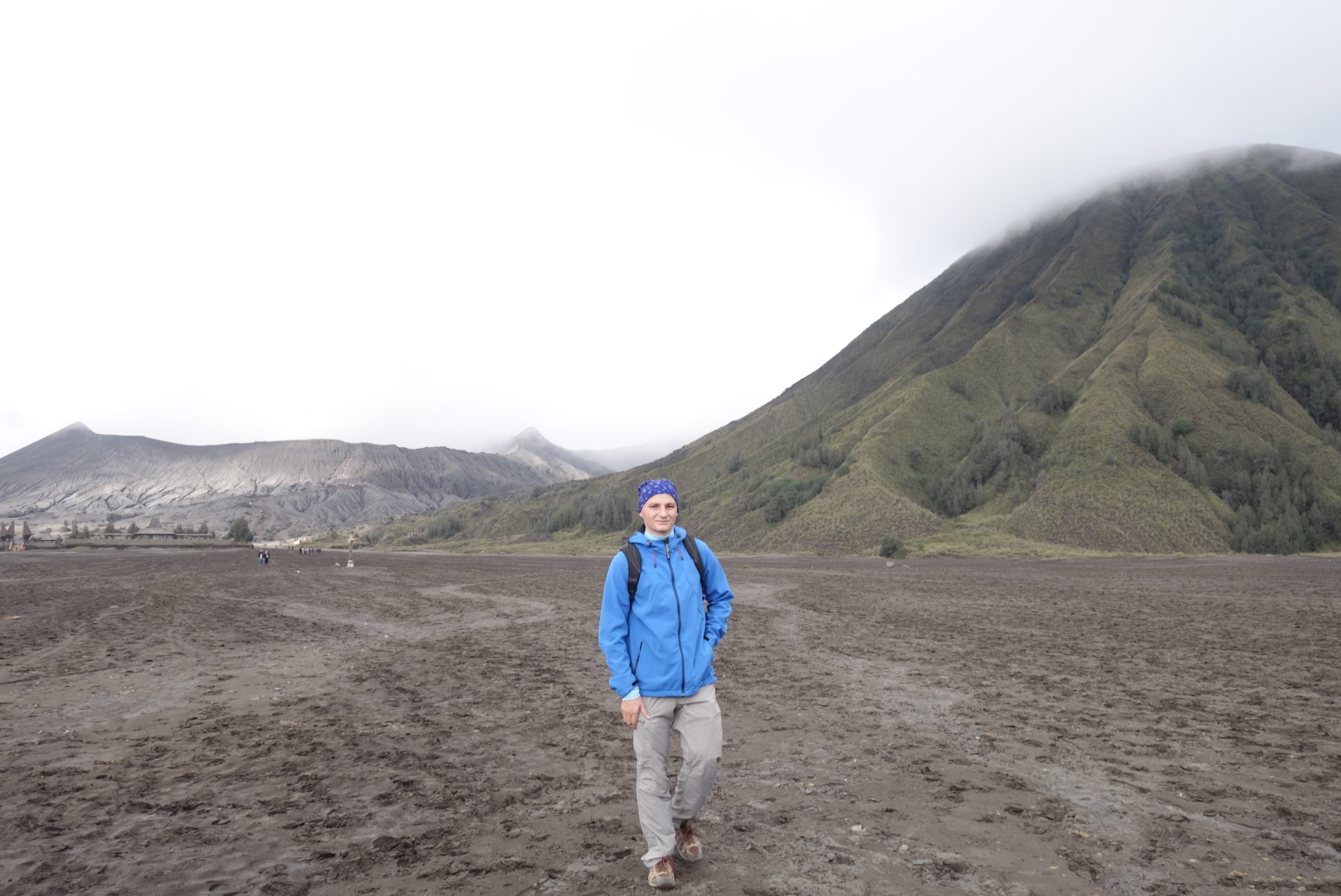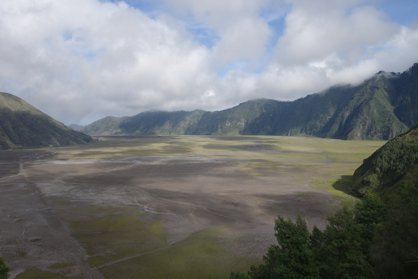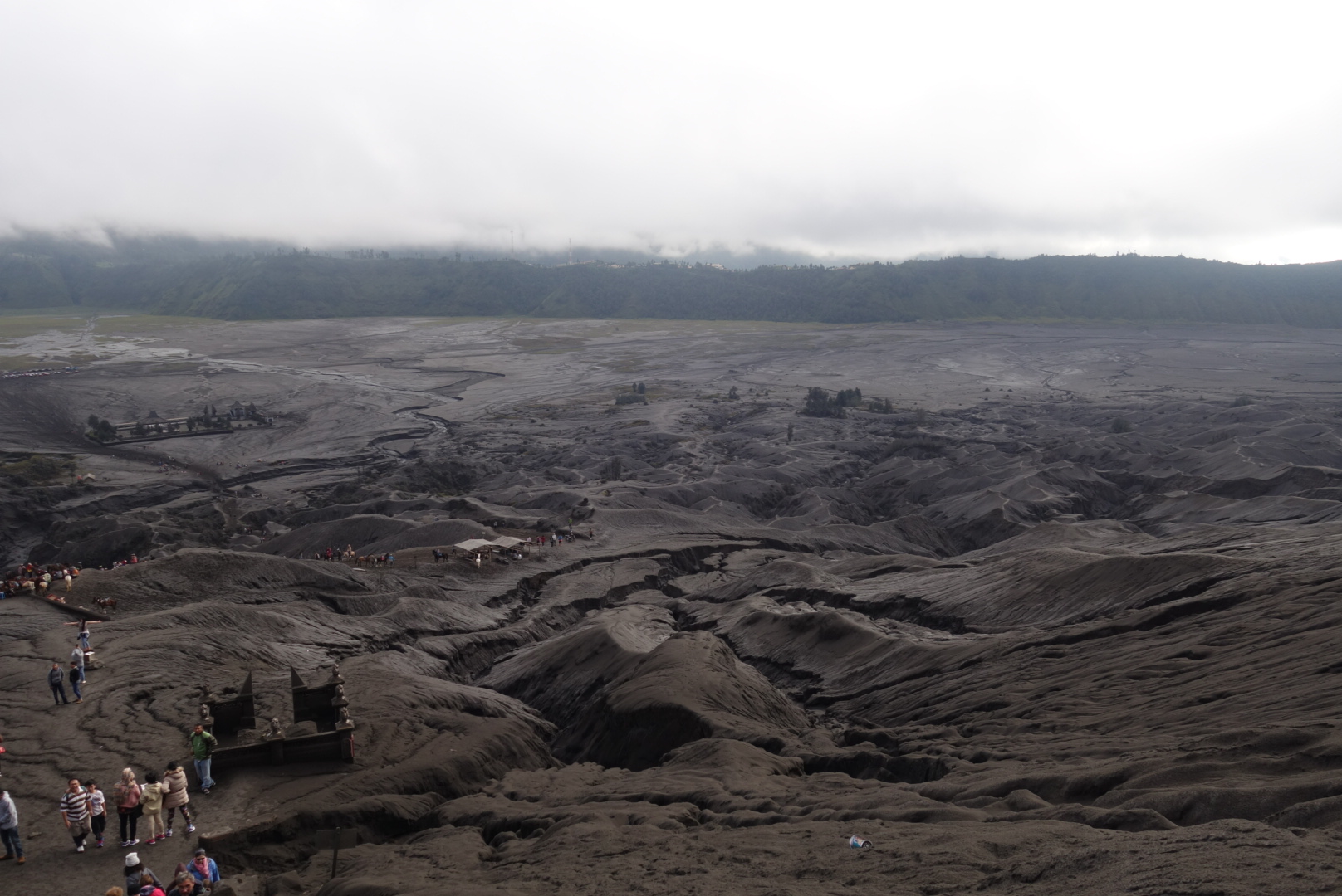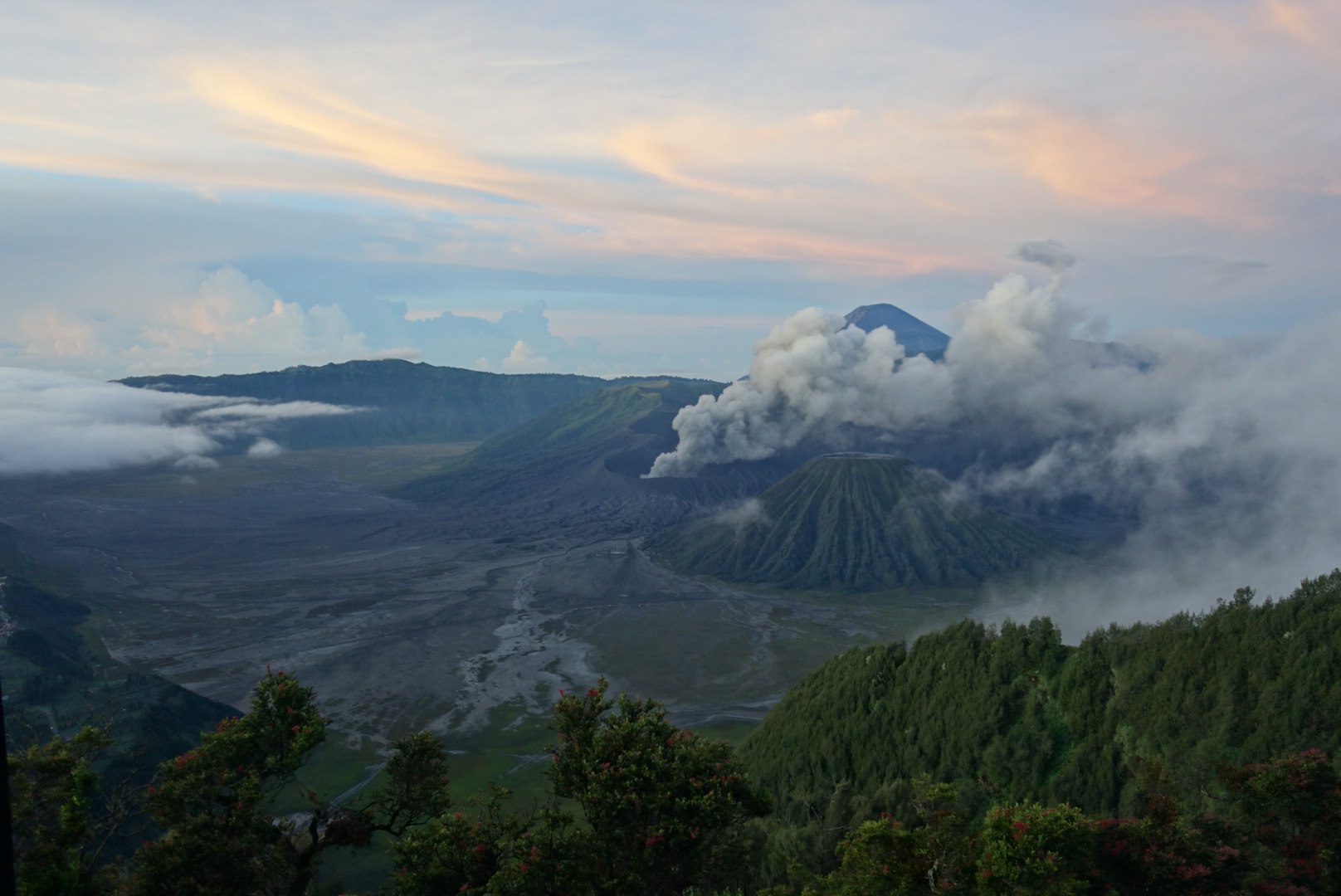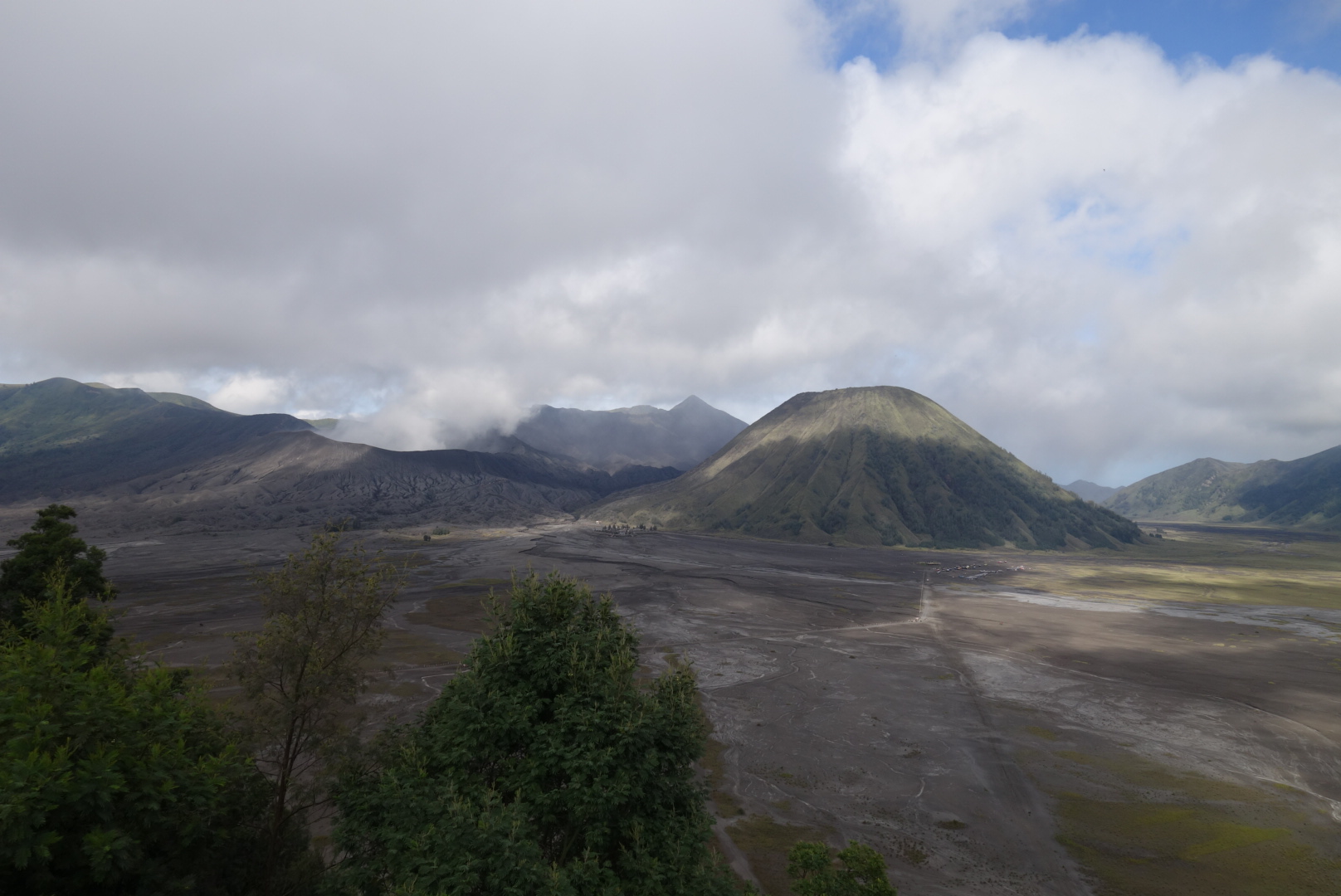 Dafür ist die Sicht über das vor uns liegende Plateau ganz gut und auch der Bromo, der wie irre am qualmen ist, ist sehr gut zu sehen.
