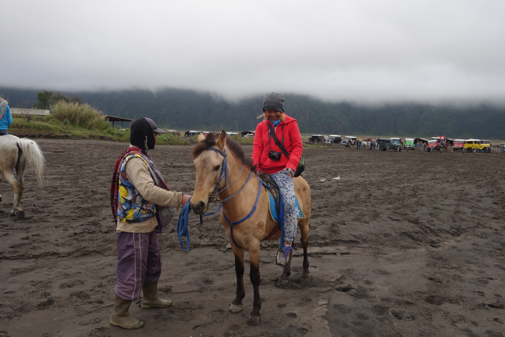 100.000Rp will der Mann von uns, dafür darf die Thailänderin zum Bromo und wieder zurück reiten.