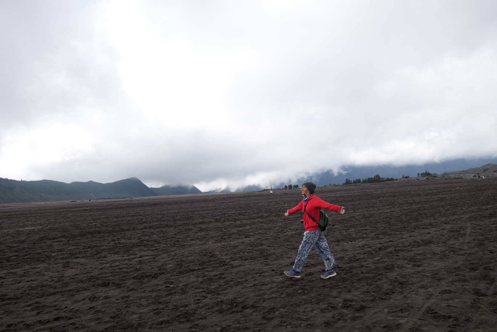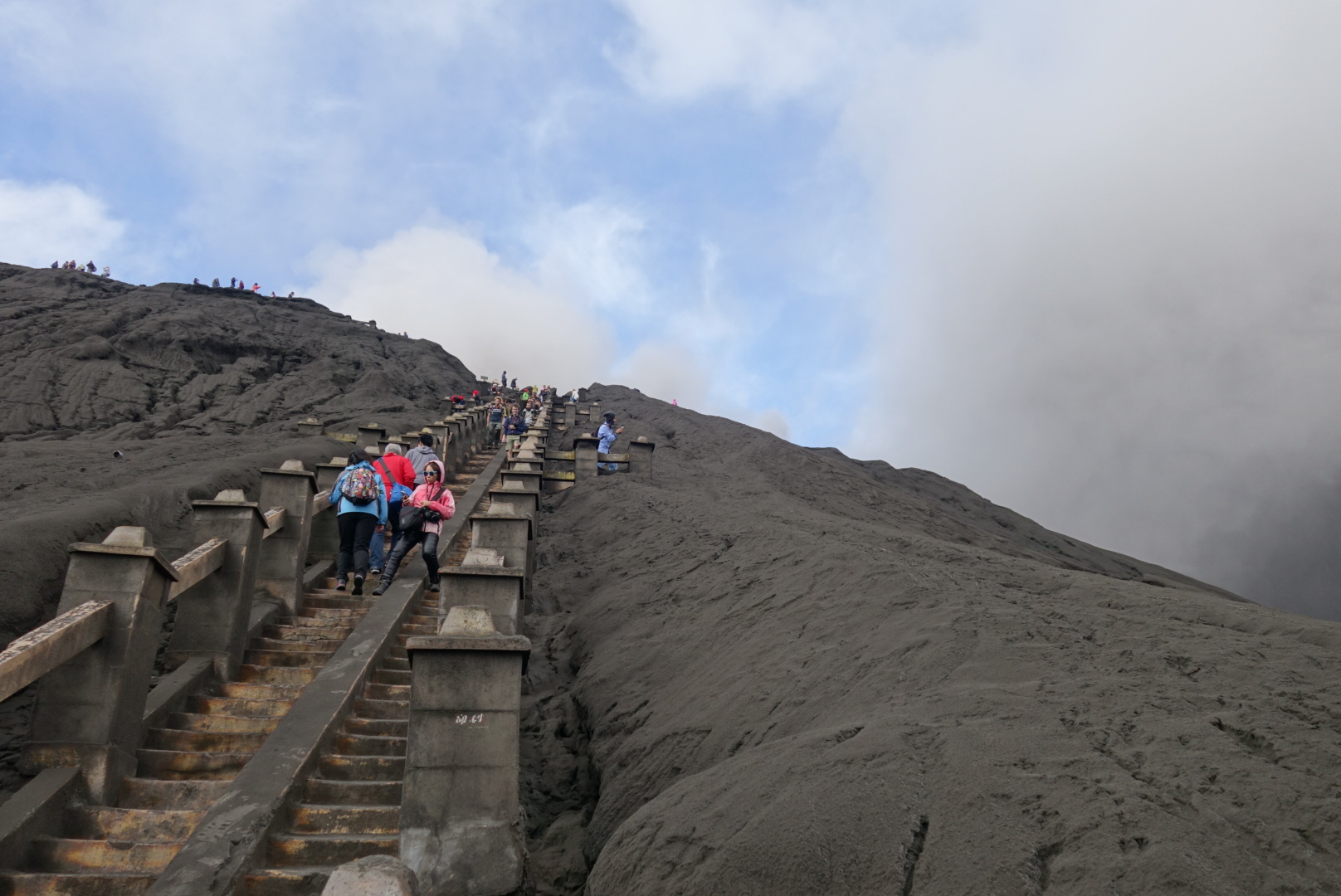 วันที่ 17 มิถุนายน 2559 เราต้องตื่นตั้งแต่ตีสามเพื่อไปชมวิวพระอาทิตย์ขึ้นจุดชมวิวอันโดดเด่นที่ปานันจากาน เราต้องนั่งรถจิบอัดกันไป 7คน รถทุกคันมุ่งหน้าไปจุดเดียวกัน คนเป็นแสนยืนรอชมพระอาทิตย์ขึ้น แทบหาที่หายใจไม่มี ร้านขายชากาแฟเต็มข้างทาง คนยืนถือเสื้อกันหนาวให้เช่ากันเต็มถามว่าวิวจุดนี้สวยไหมก็สวยนะ แต่คนเยอะเกินไป เรามีเวลายืนอยู่ที่จุดนั้นประมาณ 2ชั่วโมง และ 6โมงเช้าต้องลงไปที่รถที่จอดรออยู่เพื่อมุ่งหน้าไปยังโปรโม่ เช่นเดิมทุกคันเร่งเครื่องมุ่งไปจุดหมายเดียวกัน รถจิบเต็มไปหมดทั้งสองข้างทาง เราต้องเที่ยวแบบทำเวลาให้เร็วที่สุด รถวิ่งแค่ยี่สิบนาทีก็ถึงลานจอดรถหน้าเขาโปรโม่ ซึ่งเราต้องเดินเข้าไปด้านในอีกประมาณ 1กิโลเมตร และต้องเดินขึ้นบันไดไปอีกประมาณ 400-500เมตรได้ เห็นเหมือนจะไม่ยากและไม่เหนื่อย แต่พอเอาเข้าจริงเหนื่อยมากๆ ระหว่างเดินก็จะเห็นชาวบ้านจูงม้ามาบริการนักท่องเที่ยว หากอยากสบายก็นั่งม้าขึ้นไปถจถึงช่วงบันไดได้ ราคาที่เสนอมาตอนแรกก็เป็นแสน แต่เราไม่ต้องการ เนื่องจากบอสอยากให้บลได้ประสบการณ์ขี่ม้าเลยขอเจ้าของม้าให้ไปส่งแค่ระยะทางสั้นๆในราคา 10,000รูเปีย คนม้ายอมบลเลยได้นั่ง ระหว่างที่นั่งบอสก็เดินตามข้างๆ นั่งม้าโดยมีคนคอยจูงมันไม่ได้รู้สึกพิเศษอะไรเลย เฉยๆมาก เมื่อถึงที่หมายบลรู้สึกสงสารคนม้าเพราะราคาที่ขอไปมันน้อยมากนะ บลเลยบอกให้บอสจ่ายเพิ่มเป็น20,000รูเปีย ตอบแทนน้ำใจที่ใจดีให้เรานั่งระยะสั้นราคาถูก จากตรงนี้บอสเห็นร้านกาแฟก็ขอหยุดดื่มกาแฟก่อนโดยที่ไม่รีบเลย แต่บลรีบนะเพราะเราต้องทำเวลา เราต้องกลับไปที่รถตอน 8โมงเช้า อบสก็ชิวมาก บลยืนเร่งเค้าอยู่พักใหญ่เค้าเลยรีบดื่มให้หมดและเดินขึ้นไปด้านบนเพื่อชมวิวอันมหัศจรรย์ที่เรามองเห็นแต่ควันพวยพุ่งอย่างยิ่งใหญ่อยู่ตรงปากปล่อง ระหว่างเดินขึ้นนี่โคตรเหนื่อย เดินแค่ก้าวสองก้าวก็เหนื่อยมาก เกือบไม่ไหวแต่ใจสู้ เมื่อถึงด้านบนก็เห็นถึงความอลังของที่แห่งนี้ เสียงระเบิดจากด้านล่างดังขึ้นตลอดเวลา ควันกระจายออกมาแบบไม่หยุด มองลงไปด้านล่างแบบโคตรเสียวกลัวตกลงไป ที่นี่คือนรกที่แท้จริงในความรู้สึกของบลนะ น่ากลัวอะแต่ก็อัศจรรย์ของธรรมชาติเช่นกัน เราไม่มีเวลาที่จะเดินอ้อมรอบปากปล่อง ได้แต่เดินระยะสั้นๆและถ่ายรูปไม่ถึง 1ชม. ก็ต้องรีบลงไปที่รถ เพื่อกลับโรงแรมเก็บกระเป๋าและทานอาหารเช้าที่โรงแรม พร้อมกับเช็คเอ้าท์รอรถมารับเพื่อไปยังคาวาอีเจี้ยนต่อ