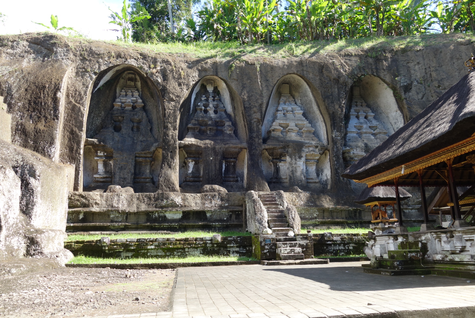 Unten angekommen gehen wir erst einmal nach links, hier sieht man 4 Nischen mit sogenannten „Candis“, die – wie die gesamte Anlage – im 11. Jahrhundert zum Gedenken an die Königsfamilie Udayana entstanden sind. Vielerlei Legenden ranken sich um die Entstehung und Bedeutung dieser in den Felsen gehauenen Schreine. Auf jeden Fall sind sie mit ihren rund 7m Höhe echt beeindruckend und wir machen natürlich wie immer ohne ende Fotos.
