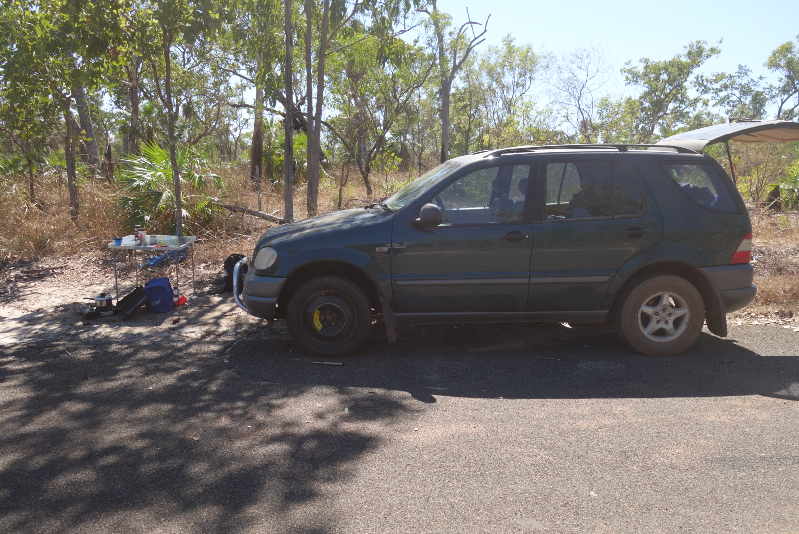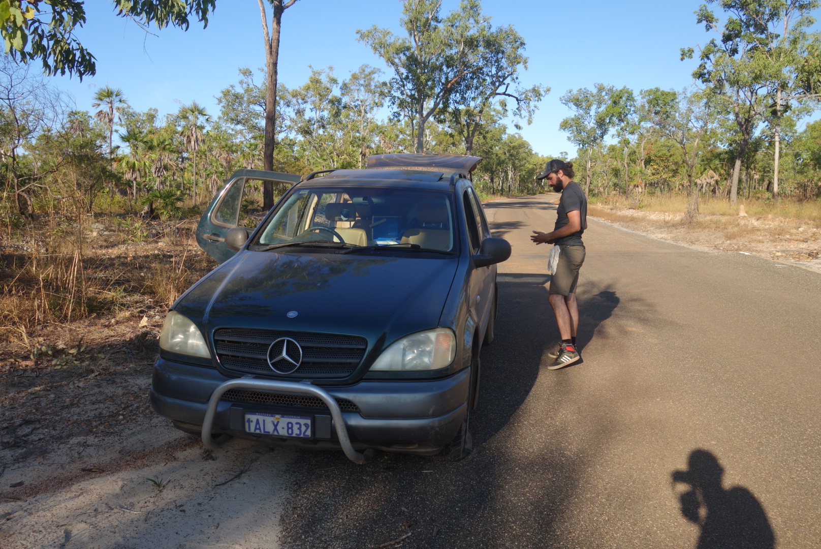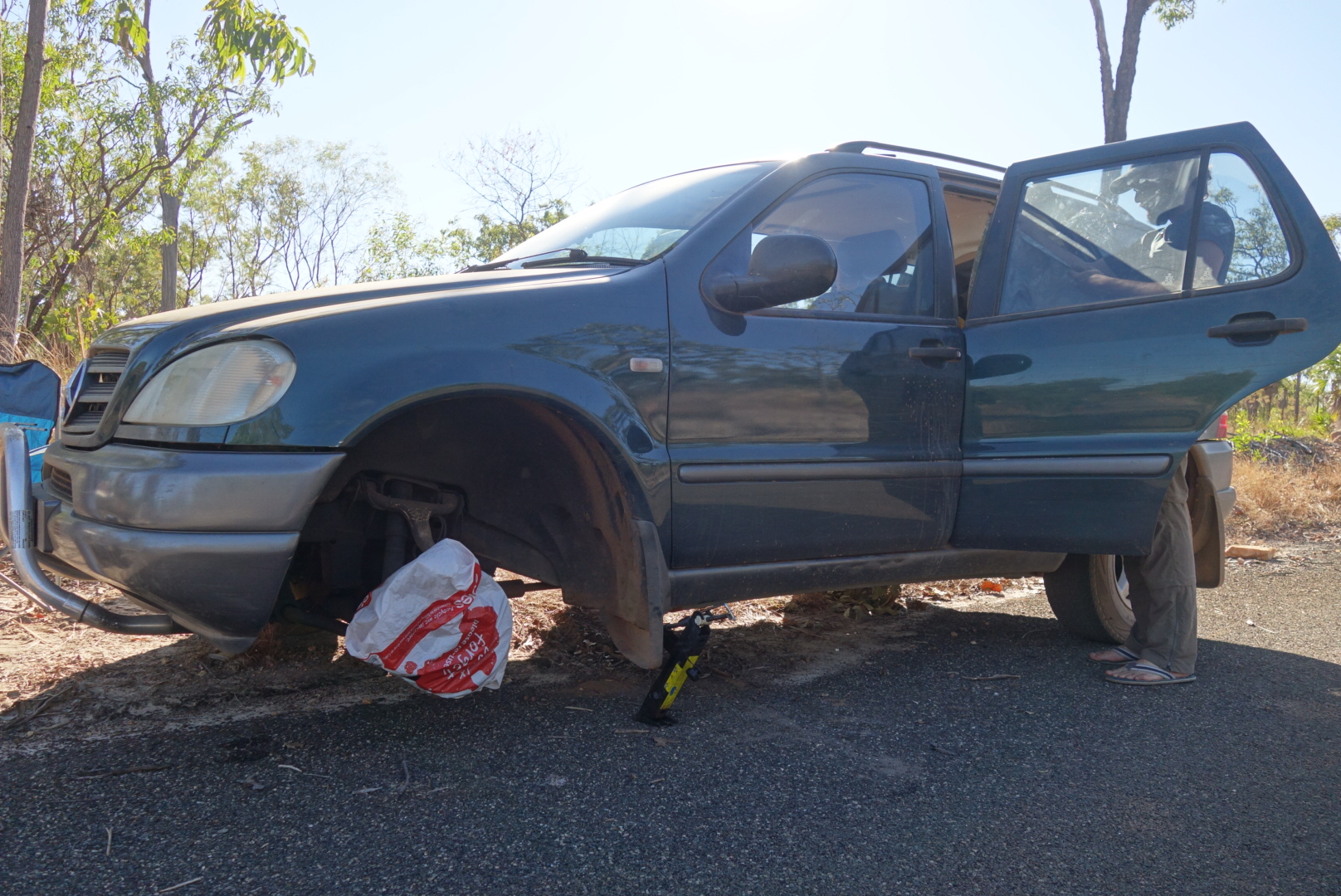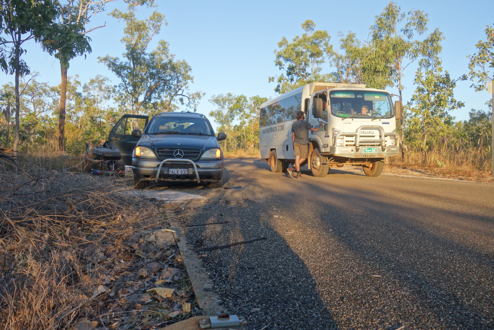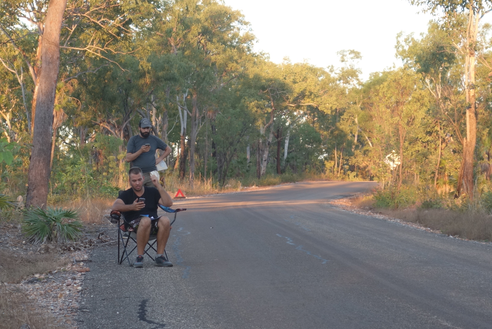 Nach einer zusätzlichen Ewigkeit und der Hilfe eines Australiers, der auch hier unterwegs ist und (wie alle Autos die hier vorbei kommen hat auch er seine Hilfe angeboten) warten wir auf den Rückruf eines Pannenhelfers aus Jabiru.
