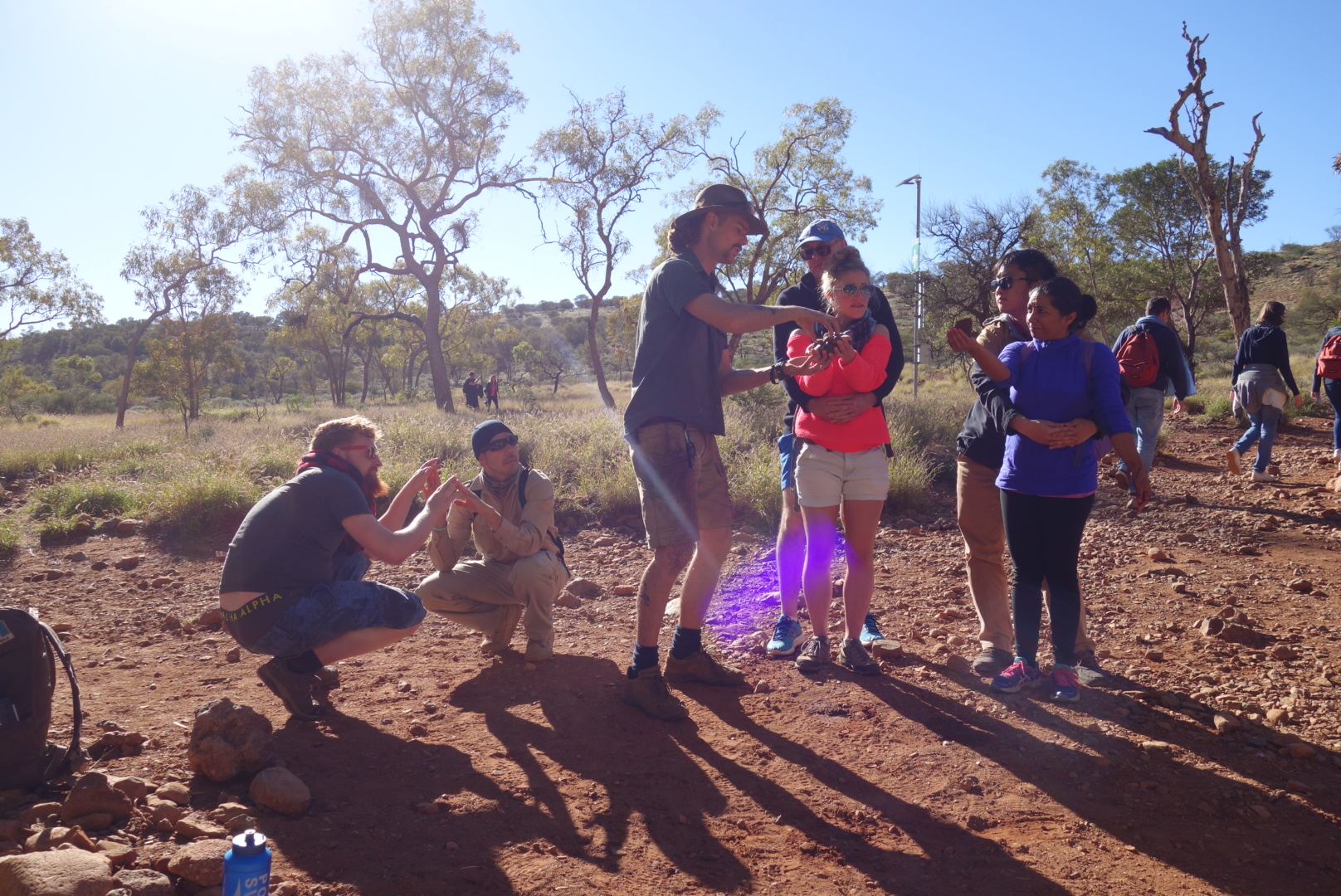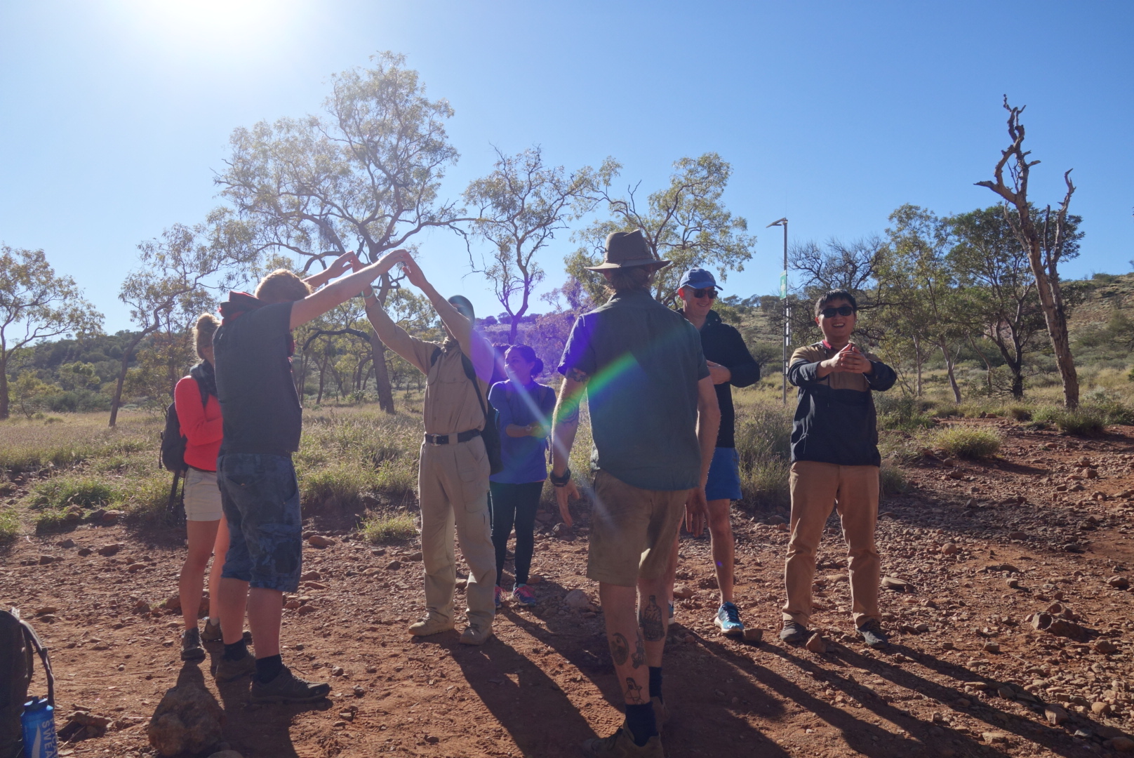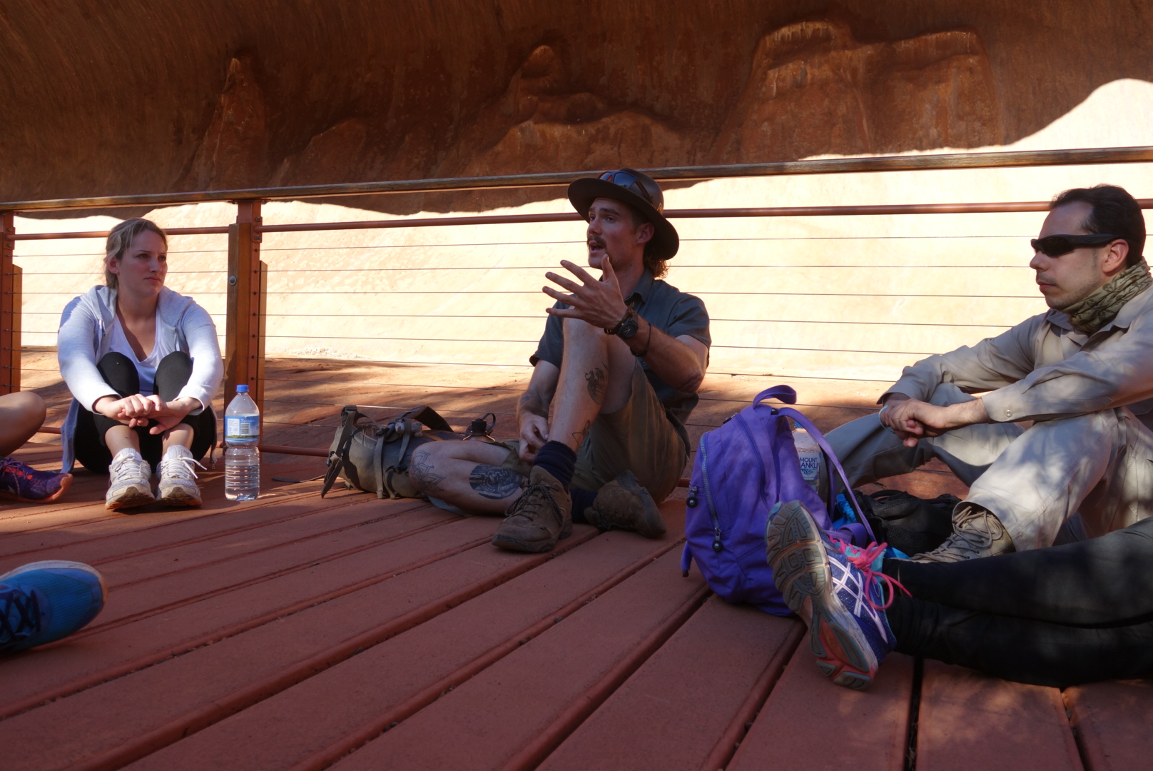 Gemeinsam wandern wir ein kleines Stück, bis wir an einem schattigen Plätzchen halt machen und uns Matt ziemlich beeindruckend und mit Hilfe von 4 Leihenschauspielern die Entstehungsgeschichte dieser Felsen erklärt.