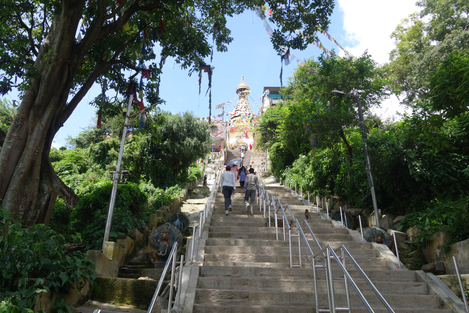 Dann erreichen wir endlich sie Treppe mit den 365 Stufen, die auf den Hügel auf dessen spitze die Swayambhunath Stupa zu sehen ist.