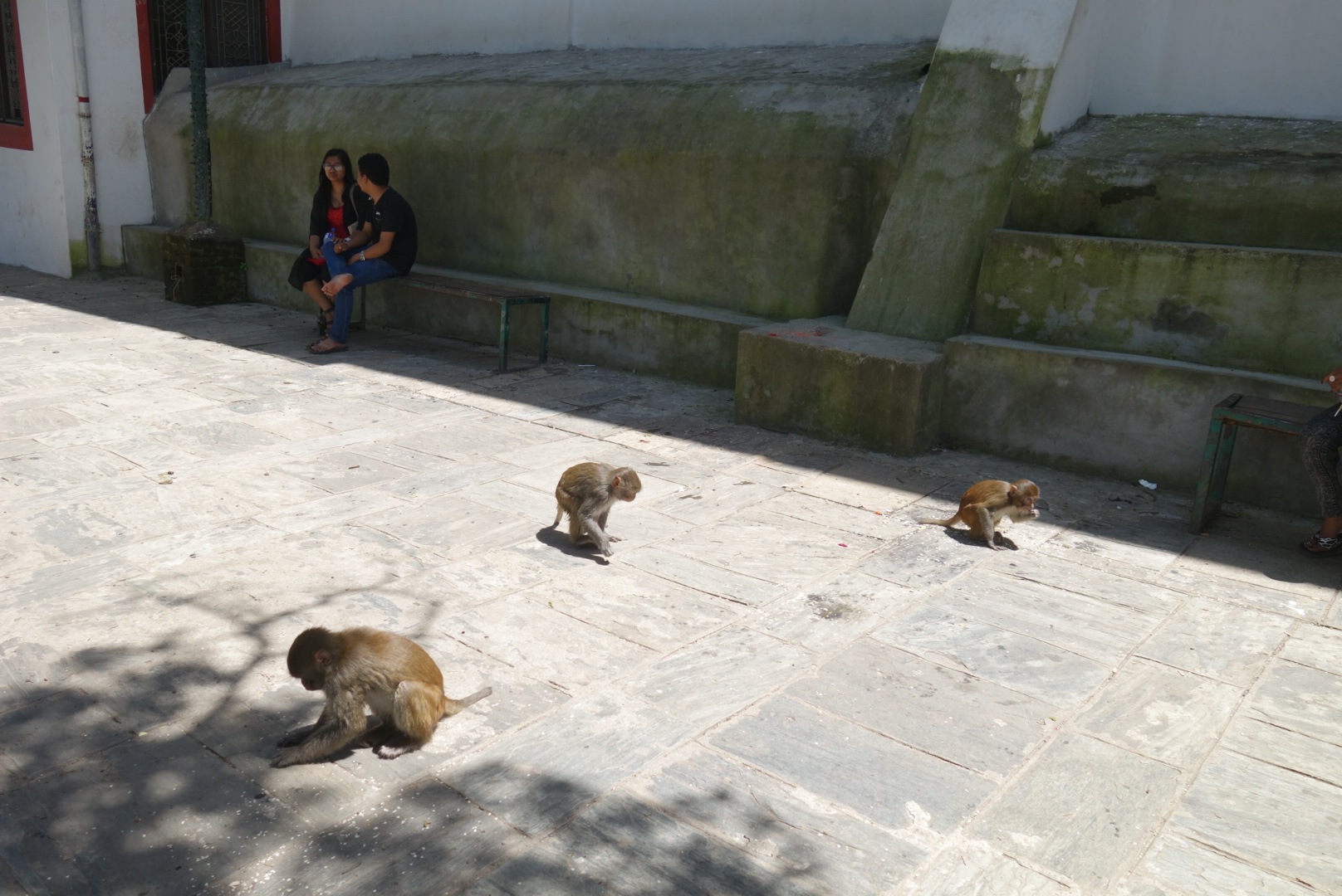 Wir müssen aber natürlich erstmal ganz nach oben und auf dem zugegeben schweißtreibend Aufstieg treffen wir auch auf einige der Gesellen, denen dieser Ort auch seinen inoffiziellen Zweitnamen zu verdanken hat, Wem also Swayambhunath zu kompliziert ist, der kann auch einfach “Affen Tempel“ sagen.