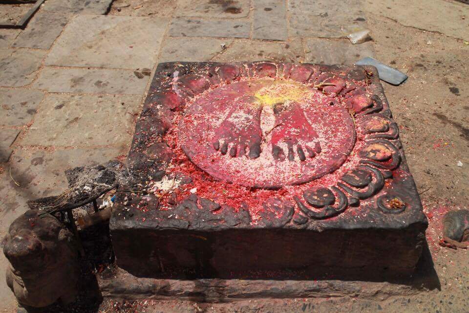 Am Fuße der Hügels sehen wir schon ein paar kleine Stupas und Buddhas, außerdem gibt es hier eine Steinplatte, mit den Fußabdrücken Buddhas.