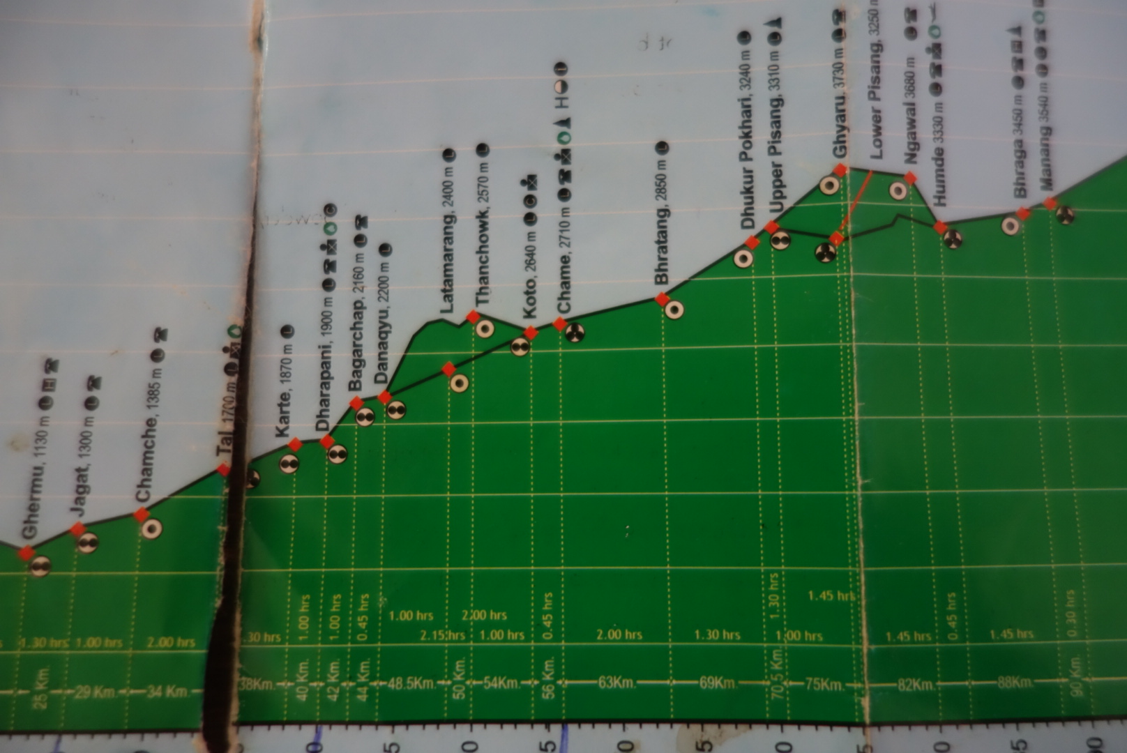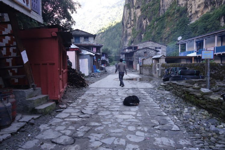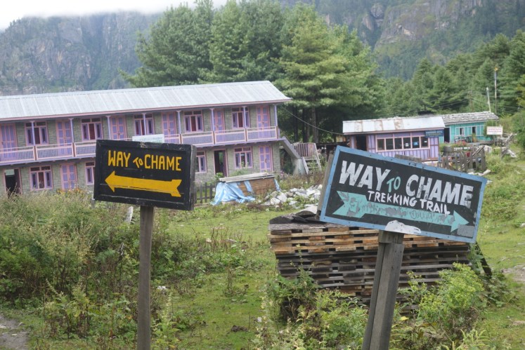 หมู่บ้านที่ห้า Chame จุดหมายที่เราจะพักค้างคืน ระยะทาง 2 กม. ที่ความสูง 2710ม. เดินในถนนไปเรื่อยๆ ไม่ไกลมาก แต่เหนื่อยและล้าสุดๆ เรามาถึงหมู่บ้านเร็วมากเพราะทางเดินง่ายๆ เราถึงที่ 14.40 น. ตอนแรกกะจะพักในใจกลางหมู่บ้าน แต่ไม่เจอที่ถูกใจจนต้องเดินไปจนสุดหมู่บ้าน ได้ที่พักราคา 100รูเปีย หรือประมาณ 32บาท ตกใจจนต้องถามซ้ำว่าใช่ราคานี้จริงเหรอ ห้องพักก็พอนอนได้สบาย แต่ห้องน้ำในห้องไม่ค่อยสะอาดเท่าไหร่ แต่ก็กำลังสร้างใหม่อยู่ ดูสวยงามเชี่ยว โรงแรมของเราคืนนี้คือ Tibet Hotel Room no. A2