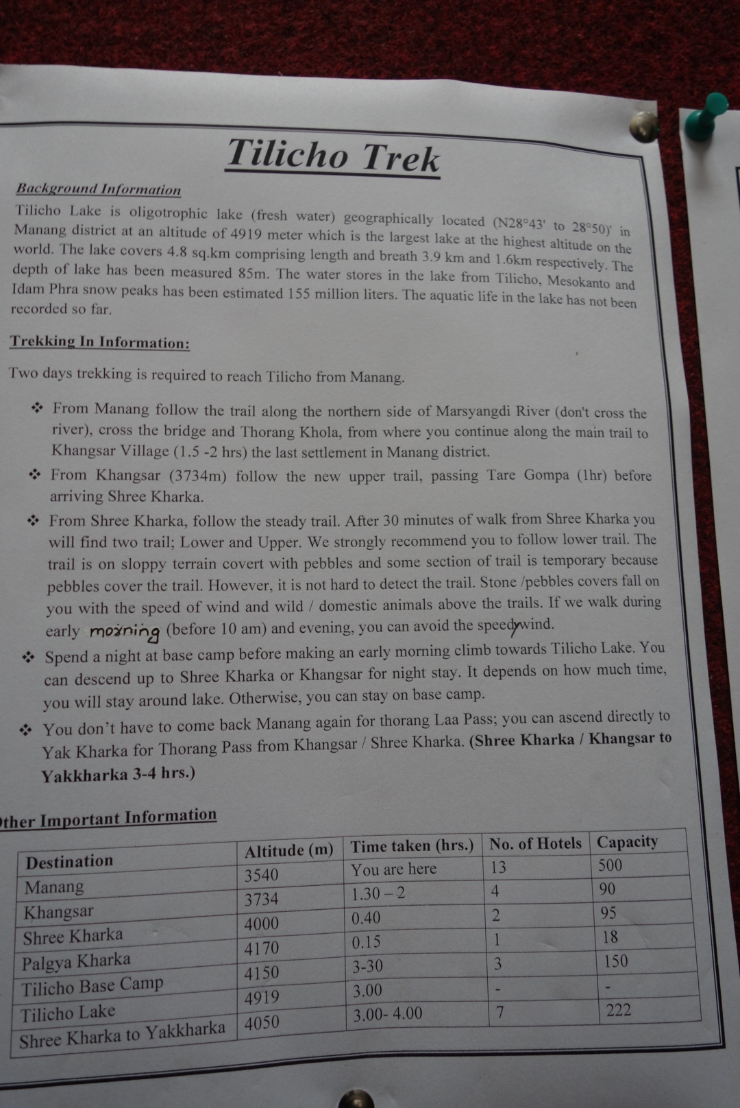 วันที่ 13 กันยายน 2559 วันนี้เราตัดสินใจจะออกนอกเส้นทางแวะไปเยี่ยมชมทะเลสาบที่สูงที่สุด Tilicho Lake จากคำพูดของหนุ่มอินเดียจึงทำให้เราตัดสินใจไปแค่เริ่มเดินก็เหนื่อยหอบแล้วระยะทางไม่ได้ไกลนะแต่จากที่ไม่เคยไปบวกกับความสูงทำให้ไม่มีแรงคือหยุดพักบ่อยมากบอสเริ่มปวดหัวด้วยคิดในใจทางนี่โคตรเชี่ยจริงทำไมมันเหนื่อยเยี่ยงนี้ แต่ก็ต้องสู้ ไม่ยอมถอยแน่ เราสู้ไปจนถึง Khangsa บอสเลยบอกให้เราพักกันที่ Shree Kharka เพื่อถนอมร่างกายกลัวร่างกายจะรับกับความสูงไม่ได้เดี๋ยวเป็นไรขึ้นมาต้องตีตัวกลับแบบไม่ได้อะไรเราเลยต้องขอพักกันที่นี่คืนหนึ่งโรงแรมทั้งโรงแรมมีเราพักกันสองคนพอฟ้าเริ่มสลัวมืดมีเสียงเปิดประตูห้องเราดังโครกครากเราเปิดม่านไปดูเห็นตัวเว็บๆเลยเปิดประตูไปเห็นว่าเป็นหนุ่มอินเดียเจ้าเดิมไม่รู้เข้าใจไรผิดหรือเปล่า หรือตั้งใจ ที่จะมาเปิดประตูห้องเราแบบเสียมารยาทเยี่ยงนี้พอางคืนเราก็ได้นั่งทานอาหารเย็นและร่วมสนทนากันนิดหน่อยก่อนแยกย้ายไปพักผ่อน