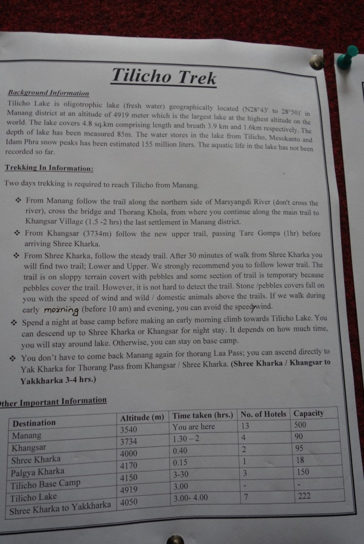 สรุป เริ่มเดินจาก Manang 8.40น. ออกเดินทางไปยัง Tilicho Lake ปีนขึ้นเขาสูง 4000ม. ไปไม่ถึง ระยะทาง 8.4กม. พักที่หมู่บ้าน Shree Kharka เวลา 14.00น. โรงแรม Tilicho Peak room 202