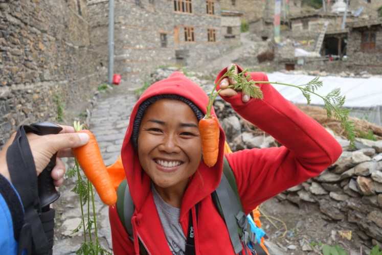 Gerade als wir auf ihrer Höhe sind, bleibt sie stehen lächelt und schenkt uns einfach so ein paar Mohrrüben.